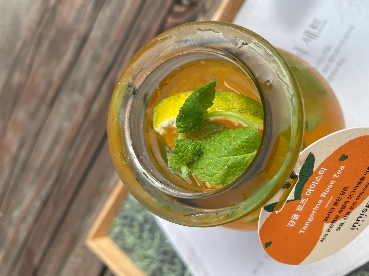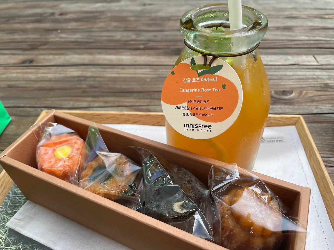 나는 어쩐지 귤밭에 온 느낌이 들 것 같은 음료를 한잔과 약과를 닮은