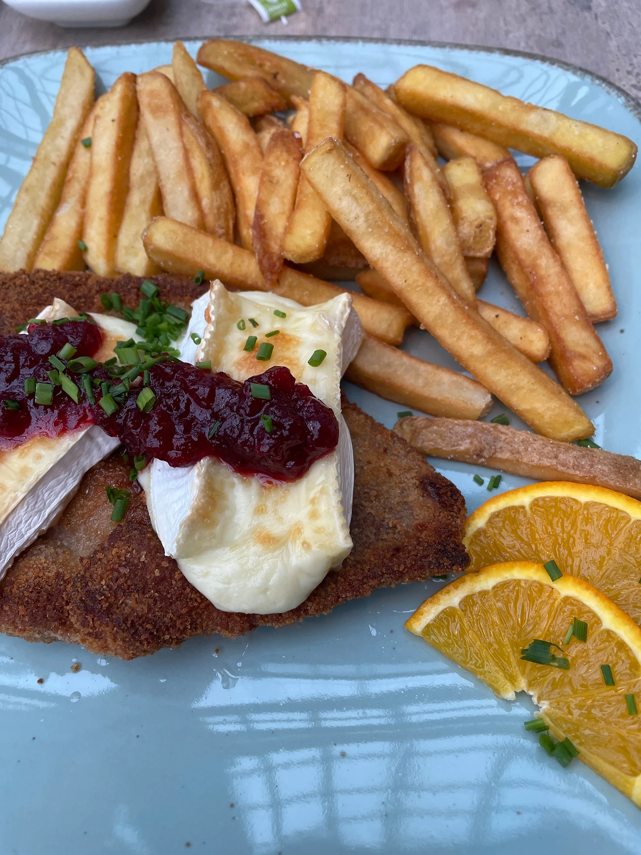 먹다가 그날의 본요리인 슈니첼(독일식 돈가스)과 감자튀김이 나와서