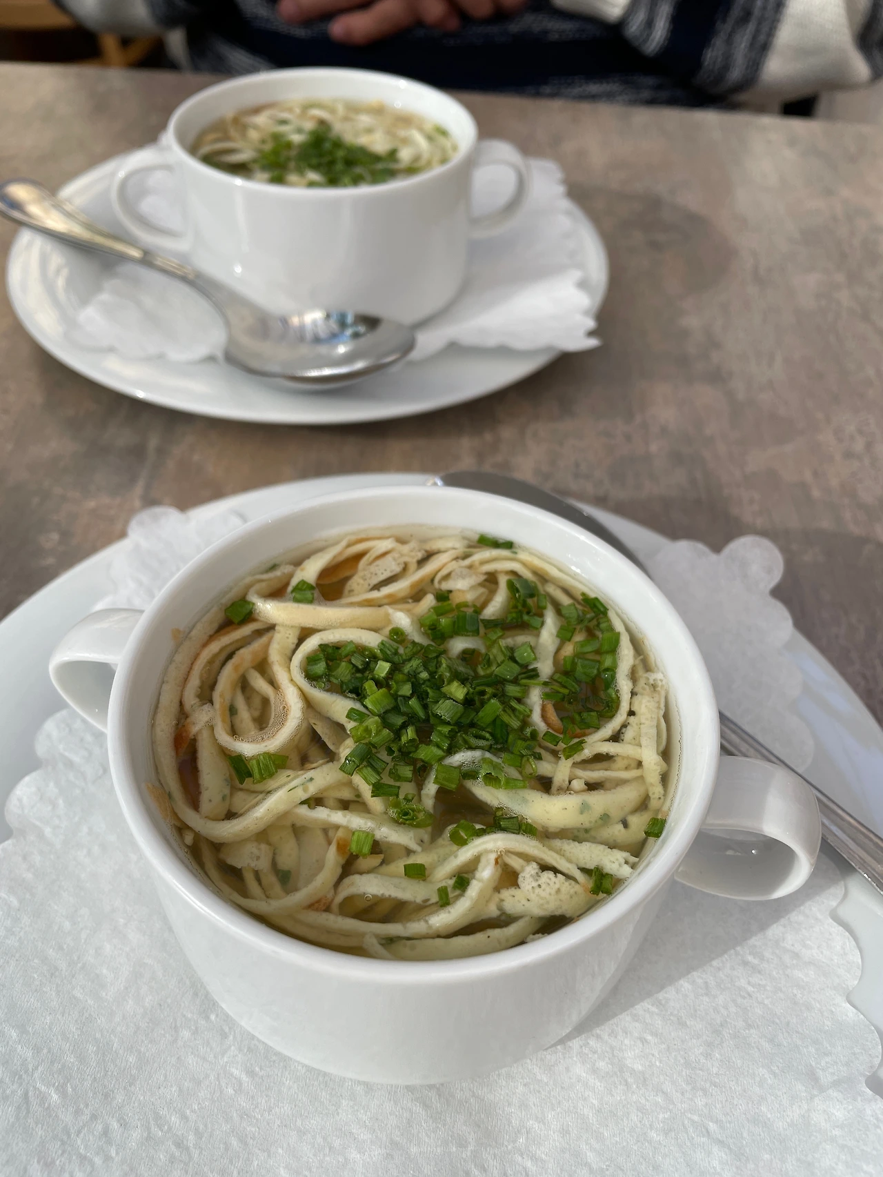또 다른 날은 수프, 감자샐러드와 빵 그리고 독일 소시지, 케이크 한 조각