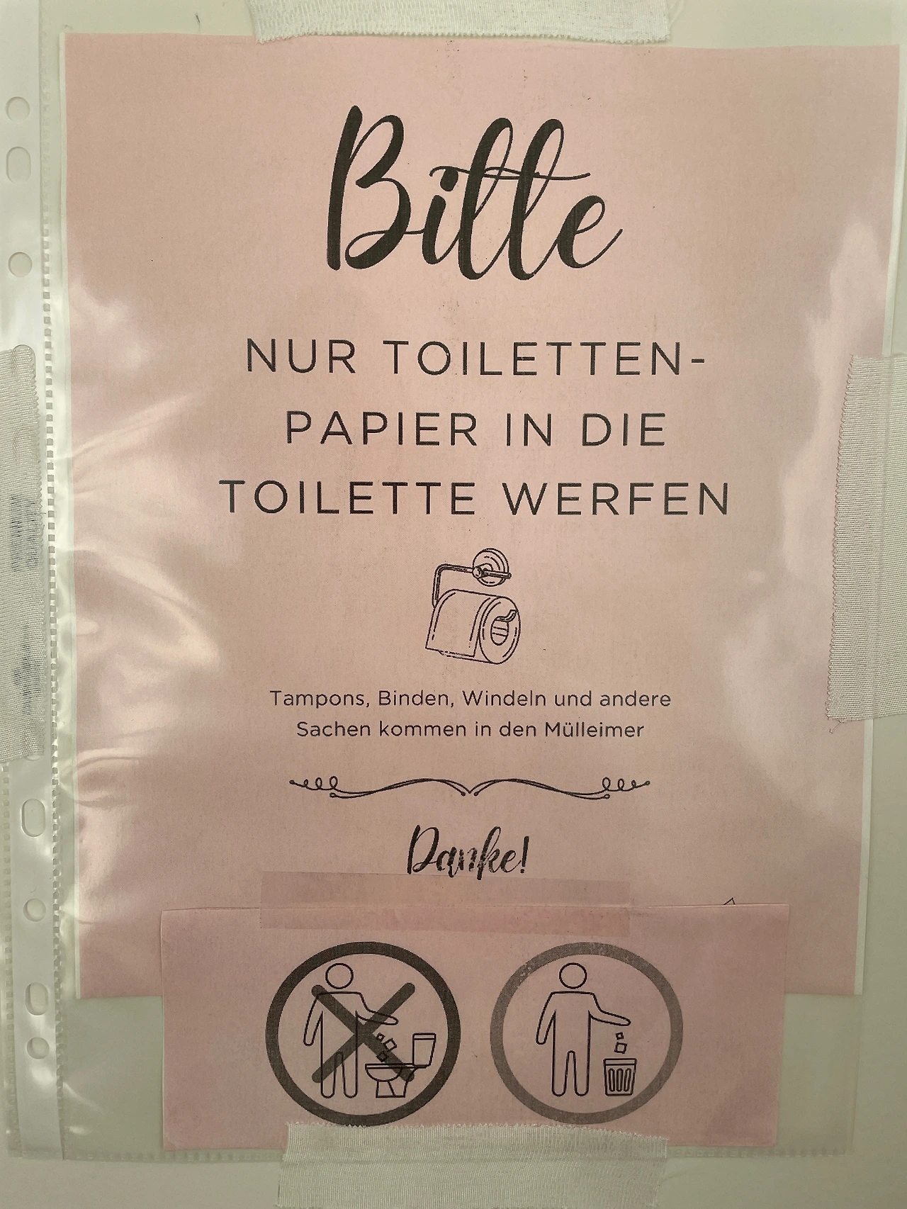 독일어로 플리즈에 해당되는 Bitte! 비테 제발! 을 크게 쓰고 변기 안에는 화장실용 두루마리 휴지만 넣어 달라는 것과 다른 것들은 휴지통에 넣어 달라는 문구와 그림..