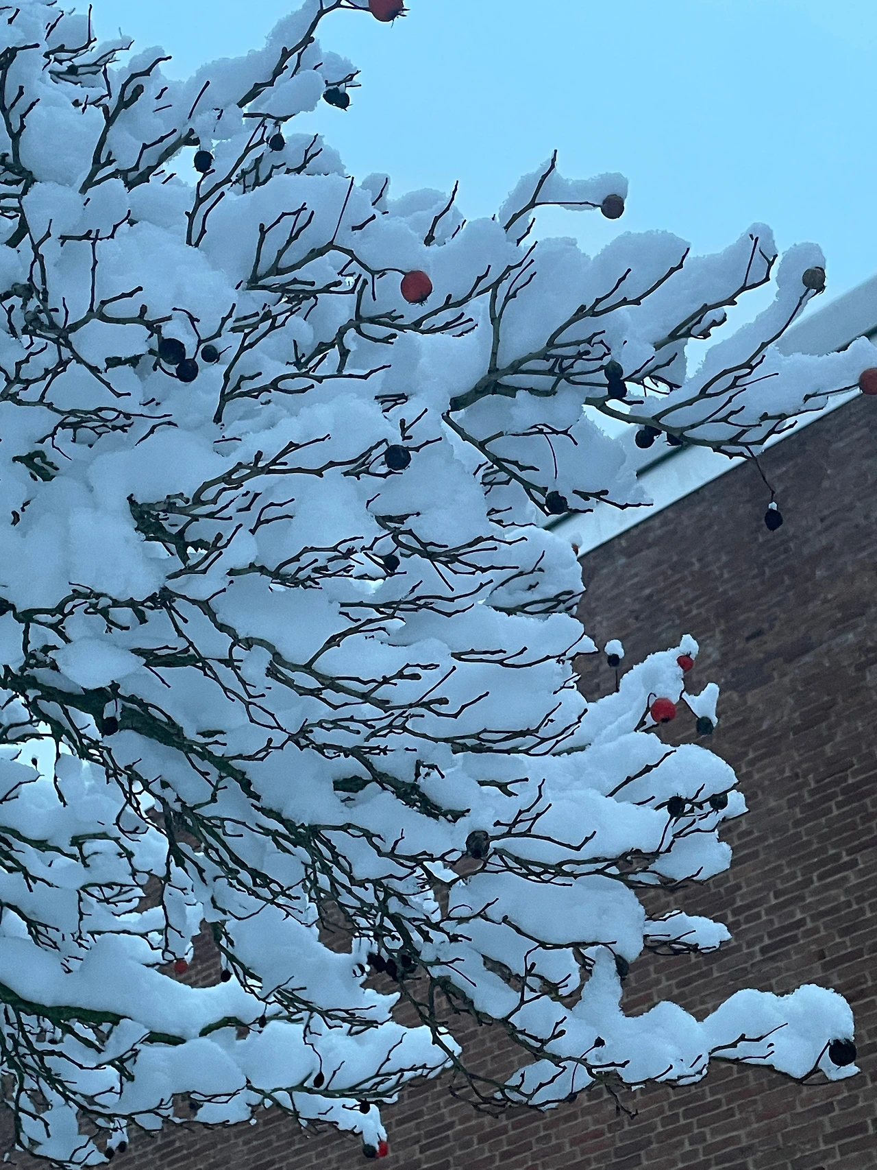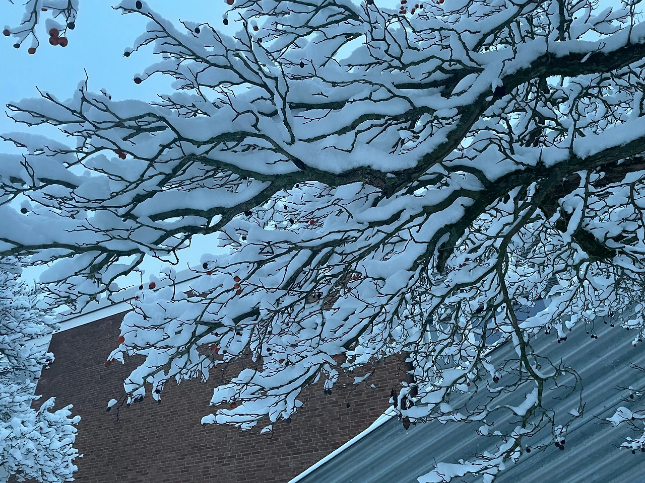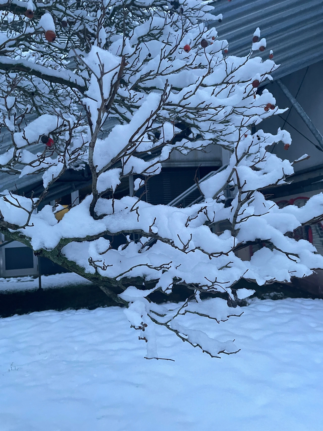 나뭇가지 꼭대기에 아직 채 떨어지지 않은 이름 모를 주홍빛 열매가 가지마다 가득 피어난 눈꽃 위로 빨갛게 나와 인사를 전한다.