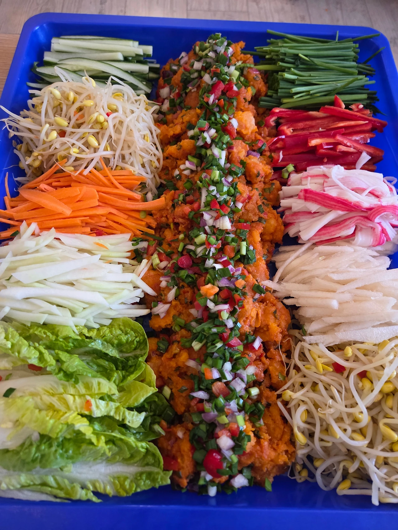양념에 버무린 새우를 접시 가운데 마치 고속도로 달리다 만난 터널처럼 수북이 담고, 냉장고에 있는 온갖 채소를 채 썰어 화려하게 둘러 담았다. 그리고 코끝이 찡해지는 겨자 소스를 넉넉히 만들었다.