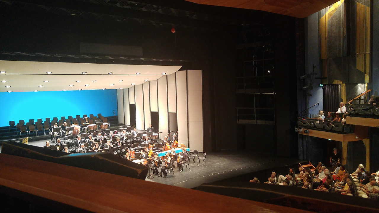 진짜 시립 오케스트라 단원 들이 악기를 들고 앉아서
