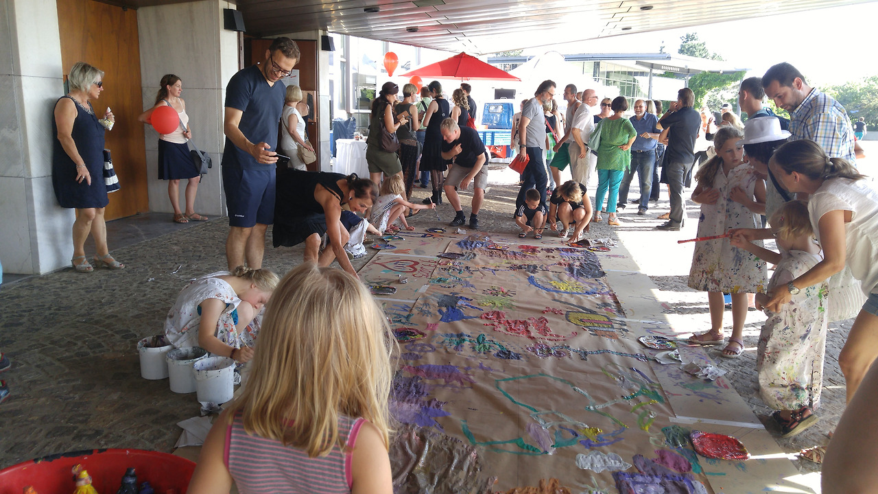 풍선을 엄마에게 맡기고 그림을 그리는 아이들...