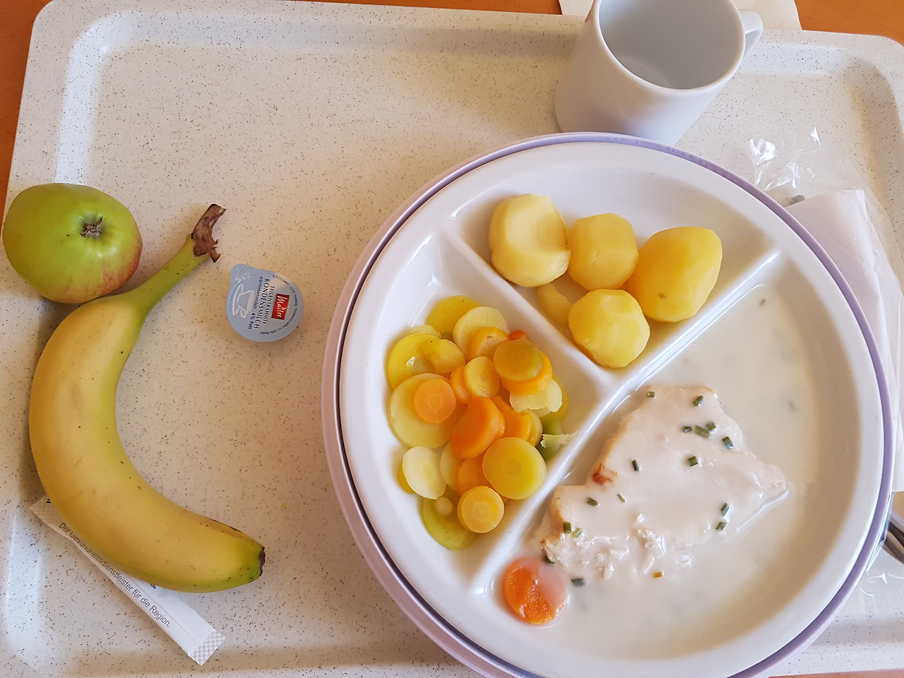 (독일종합병원의 환자식 점심으로는 감자, 고기, 파스타, 샐러드 등등 매일 다양한 메뉴를 선택할수 있고 기름을 적게 사용하는 조리법 으로 웰빙 식단 이건만....결정적으로 맛이 없다.딸내미의 세번째 옆 침대 이웃이 된 아이텔 할머니가 이렇게 이야기