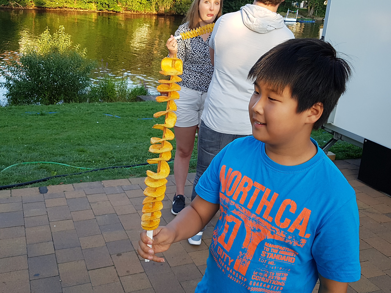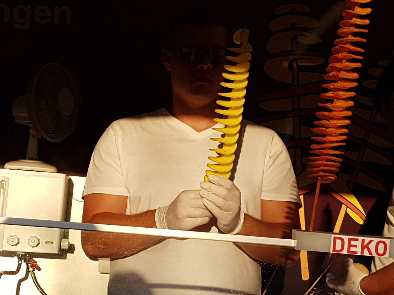맛은 감자 칩스와 감자튀김의 중간 어디쯤 있는 맛이었으나 긴 막대기에 뱅뱅 돌아가 있는 모양의 비주얼이사람들에게 저건 뭘까? 하는 궁금증을 유발해서 저절로 홍보가 되고 있는 것 같았다.