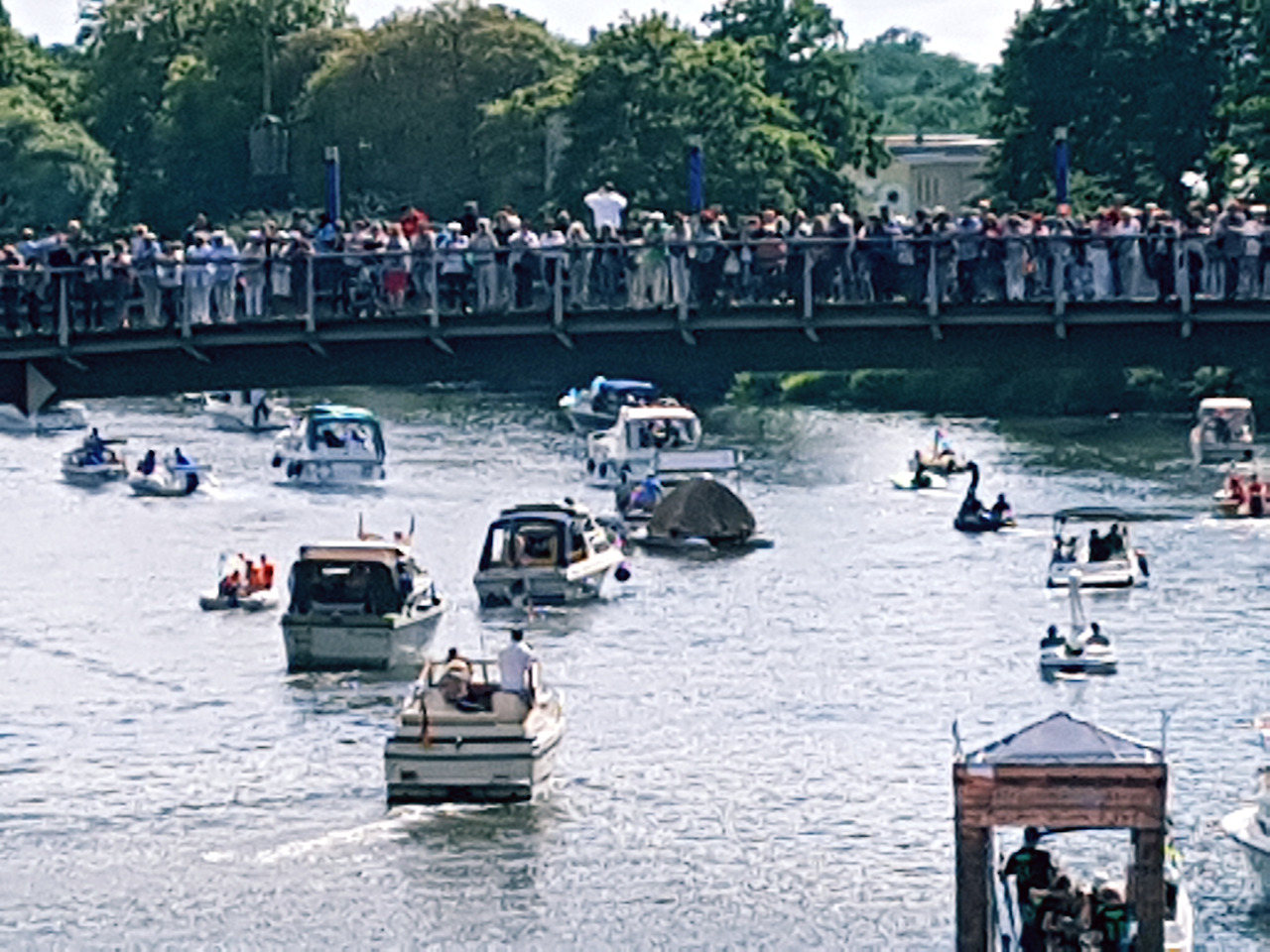 우리는 멋진 수상 퍼레이드를 다리 위에서 감상하고
