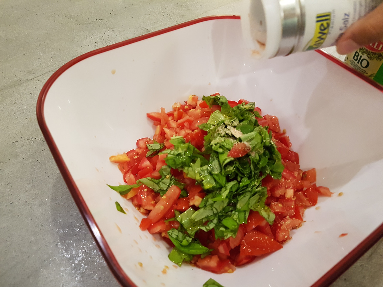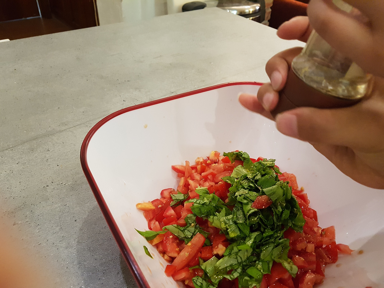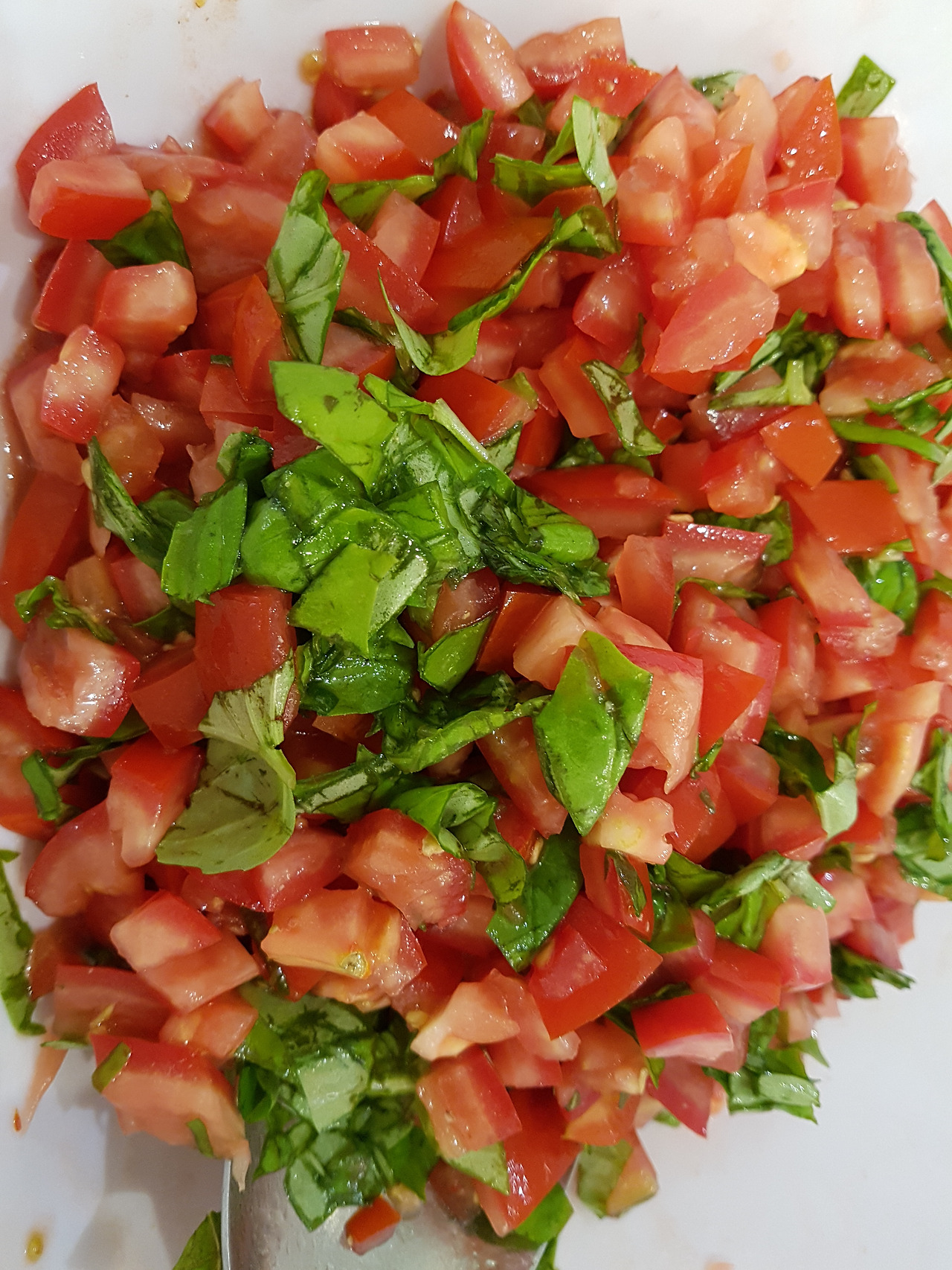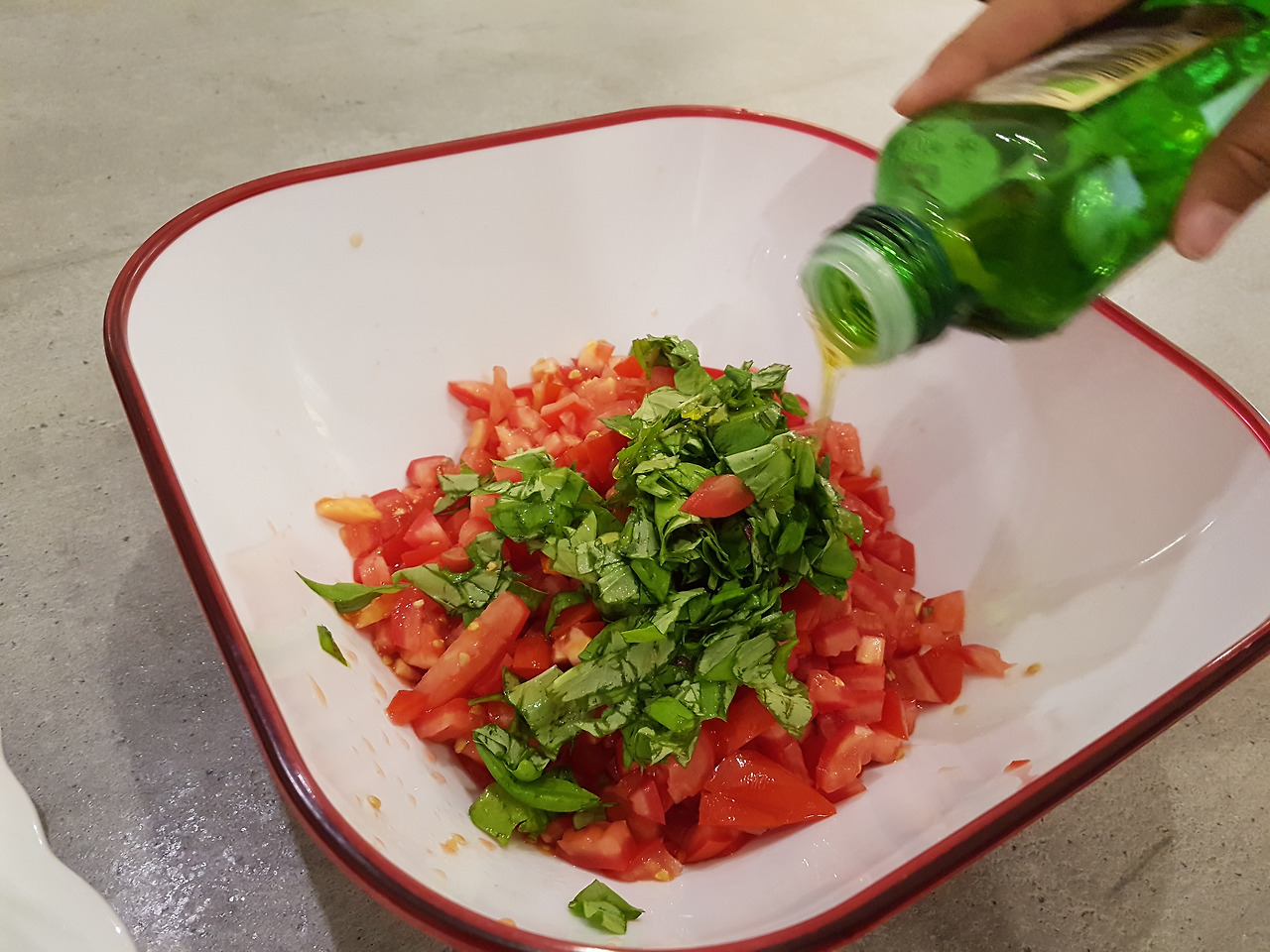 토마토를 잘게 썰고 그위에 바질리 쿰을 잘라 넣고