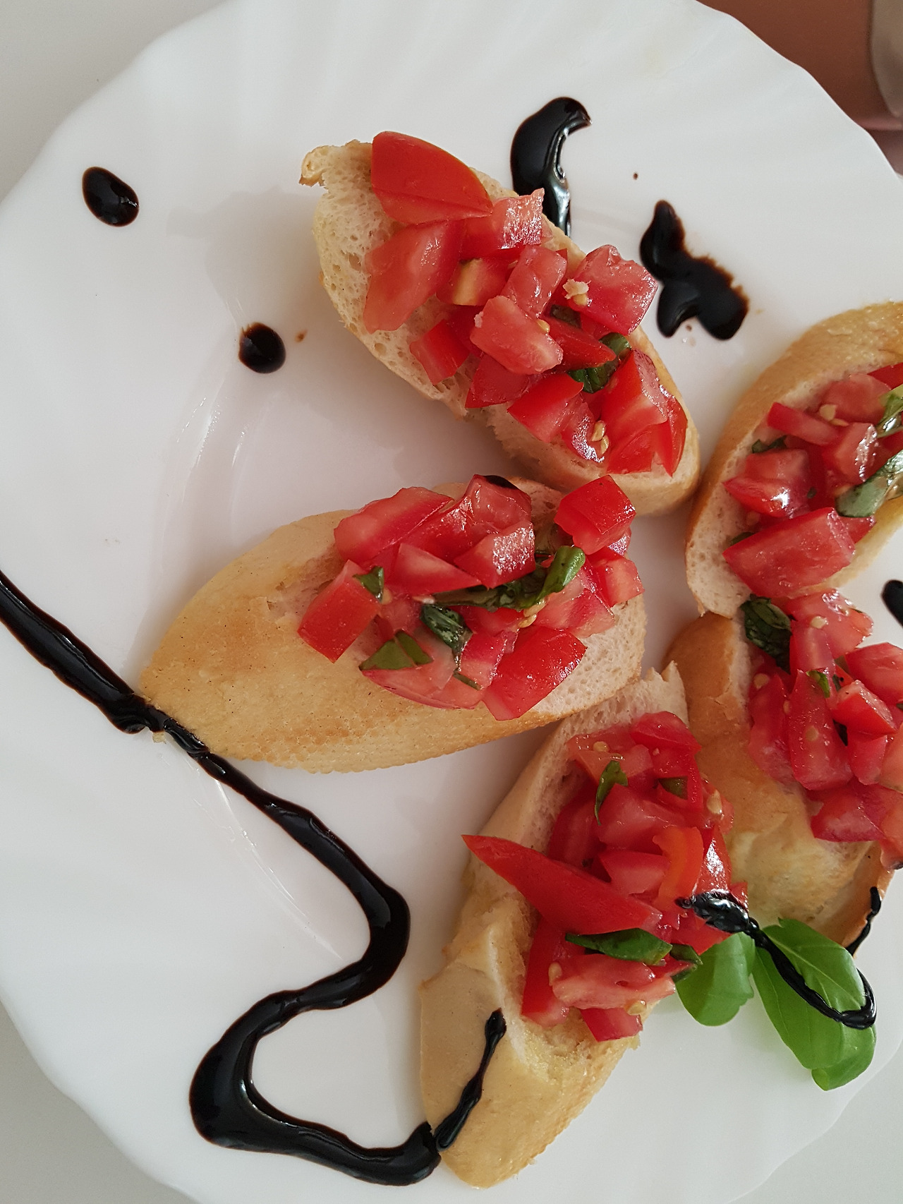 요렇게 토마토를 얹은 바게트 빵을 예쁘게 돌려 담고 발사믹 소스를 뿌려주면 레스토랑에서