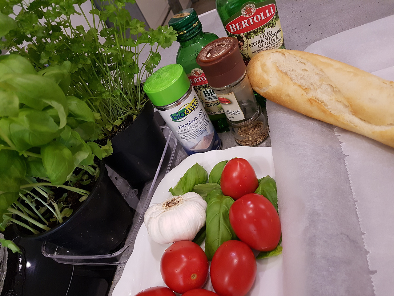 바케트 빵 하나 토마토 250g 바질리 쿰 한주먹
