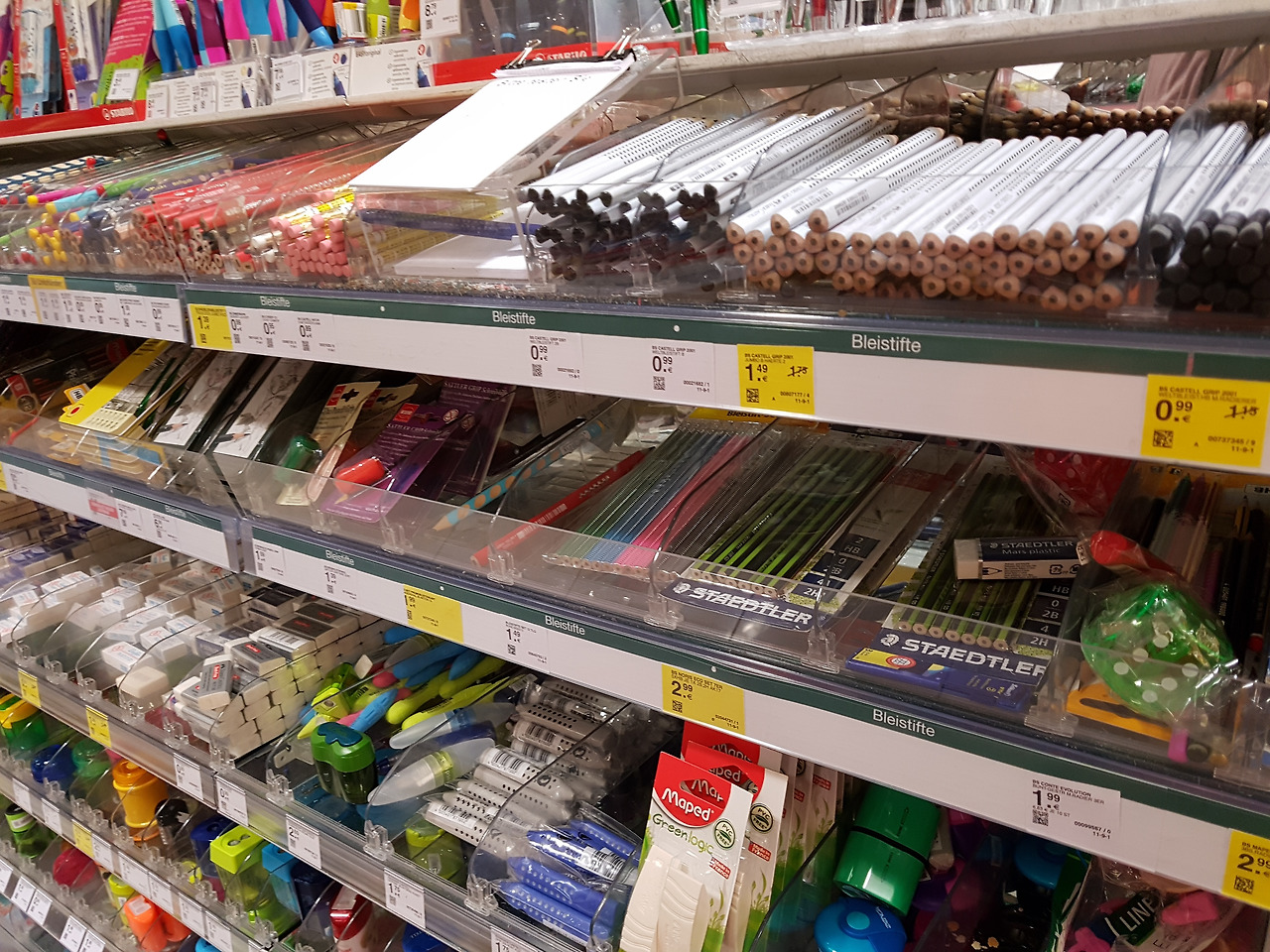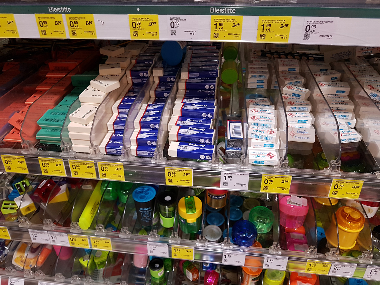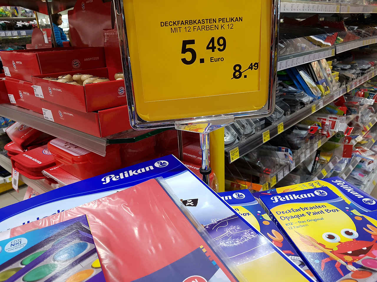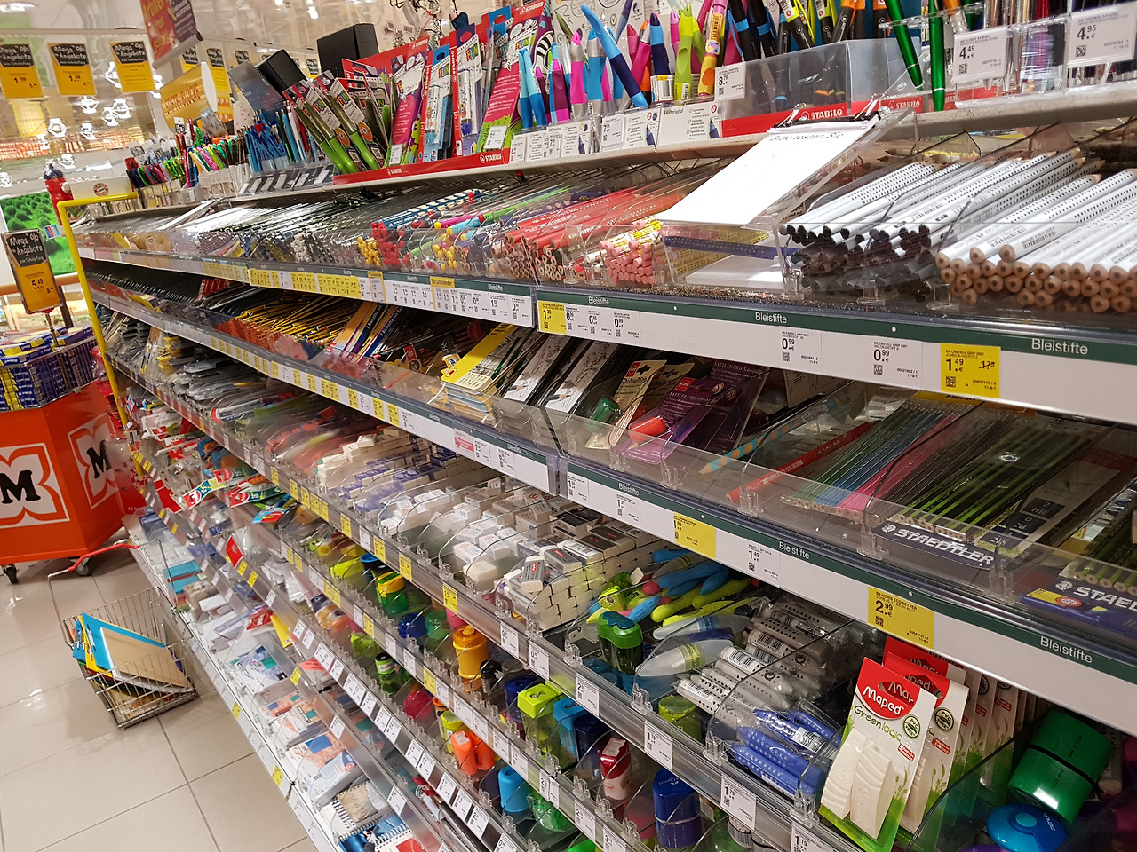 물론 독일 도 대부분의 물건 들을 모두 1유로 선에서 살 수 있는 1유로 라덴 같은 가격 착한 곳들도 있지만 학교에서 사용할 학용품은 일정 품질은 되는 것이 어야 한다. 그렇지 않으면 또 사러 나가야 하는 일이 발생하기도 한다.