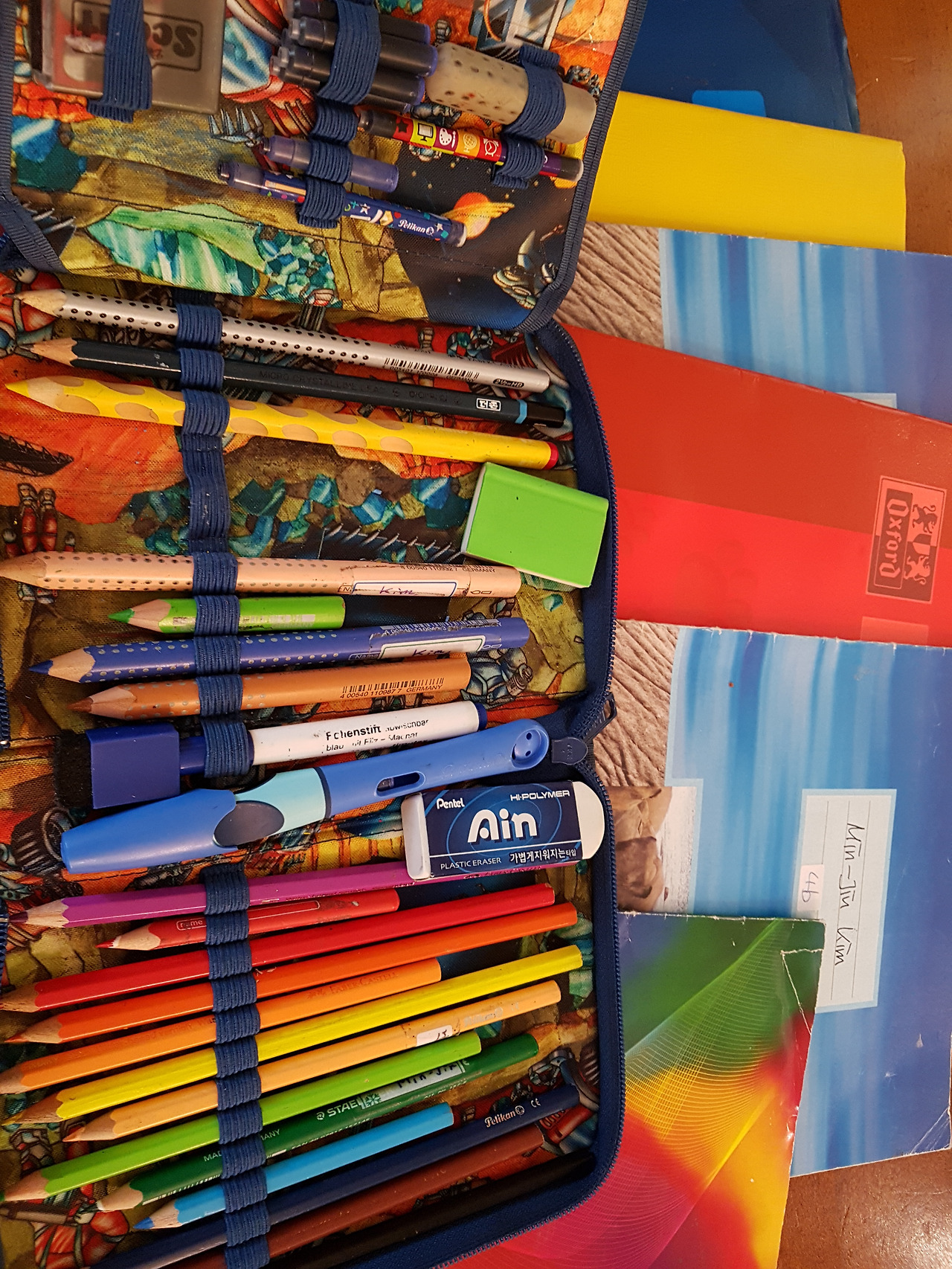 (그래서 가끔 한국에 나갈 때 연필, 지우개 등을 잔뜩 사가지고 와서는 두고 쓰고 우리 아이들 친구들 생일 선물 등으로 포장해서 주면 독일 아이들이 무척이나 좋아합니다. 특히나 알록달록 예쁜 만화 캐릭터가 그려져 있는 연필들.... 귀여운 지우개들....)