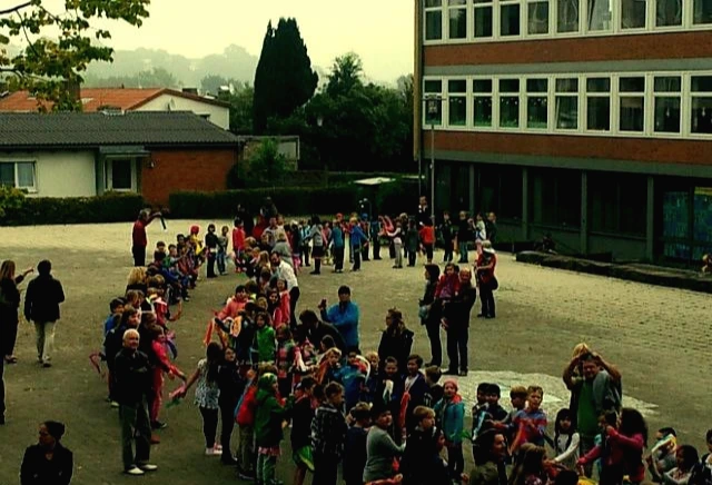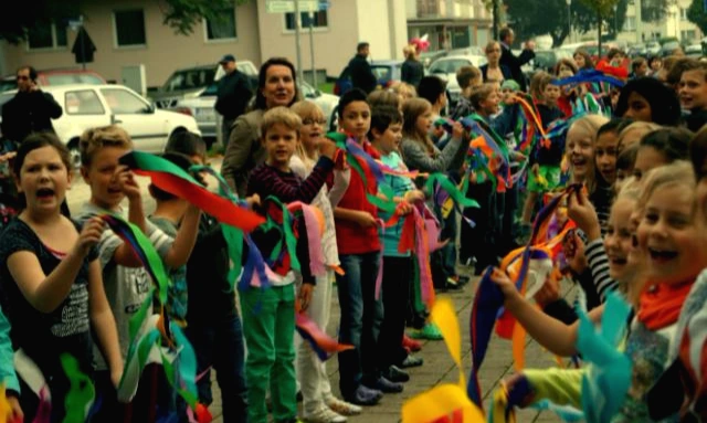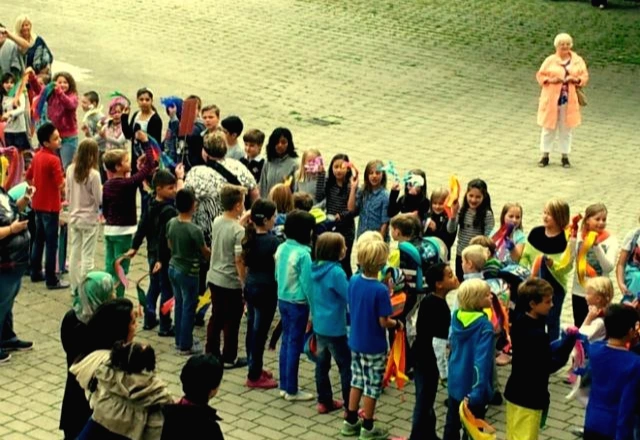 우리 반은 1 학녀 b반 까마귀 반. 독일에서 까마귀는 길조 다. 작고 귀여운 까마귀가 그려져 있는 팻말을 든 담임 선생님을 따라 밖으로 나오니 어느새 예쁜 색 색의 꽃 종이를 들고 흔들며 축하해 주는 선배들이 꽃길을 만들어 놓았다 (오늘 4학년인 우리 막내가 수업 대신할 일 중에 하나 에요. 입학하는 1학년들을 위해 열심히 꽃 종이 흔들기..)