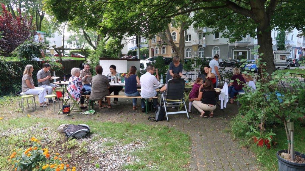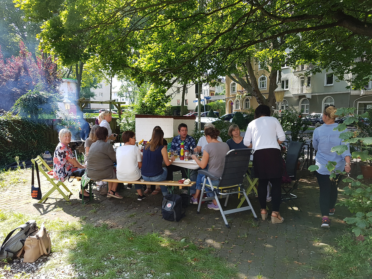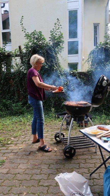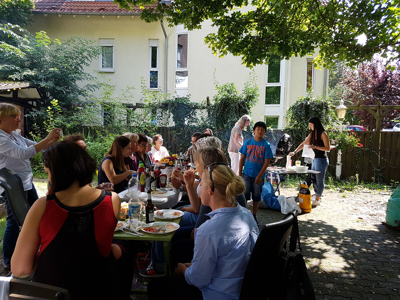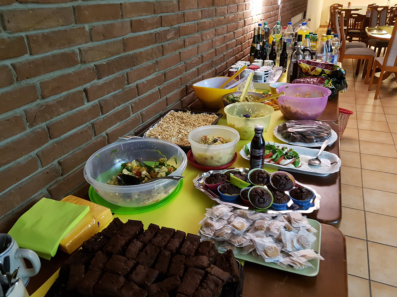 걱정스레 들쑥날쑥 하던 날씨도 하루 종일 해가 짱짱하며 여름 날씨를 선보였고 그 덕분에 노릇노릇하게 구워진 그릴 고기와 소시지도 맛나게 먹을 수 있었고 각자 준비 해온 다양한 샐러드는 고기 없이 한 접시 먹어도 배부를 만큼 넉넉했고 결국 앉으라고 준비해 놓은 지하실 은 뷔페상차림으로만 사용되어지고 모두가 정원에 둘러앉아 따사로운 햇빛 받으며 달달한 브라우니, 머핀 등의 후식까지 커피에 곁들이며 배부르고 달콤한 즐거운 한때를 함께 했다.