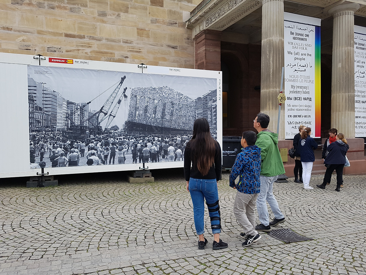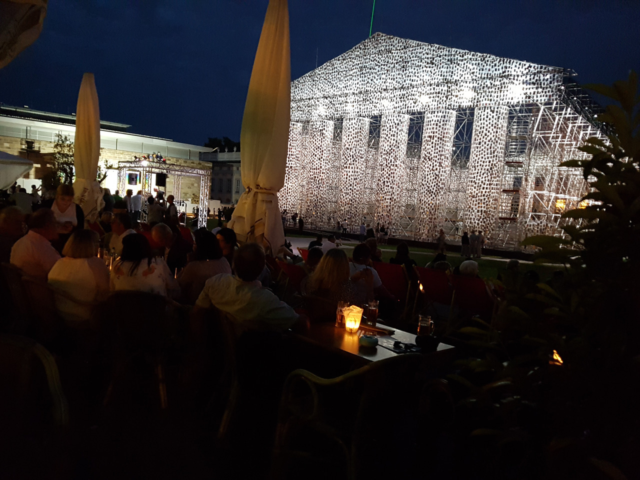 그러나 이 책의 신전은 전시공간 으로 도쿠멘타 14 전시회가 진행 되는 전시 시간 뿐만 아니라 밤에도 불을 밝히며 그 앞 비어카르텐 과 바 에 마실 나오듯 나와 앉아 연주 되는 라이브 공연 등을 즐기던 많은 도쿠멘타 관람객 들과 카셀 시민 들 에게 사랑방 같은 분위기도 얹어 주었다.