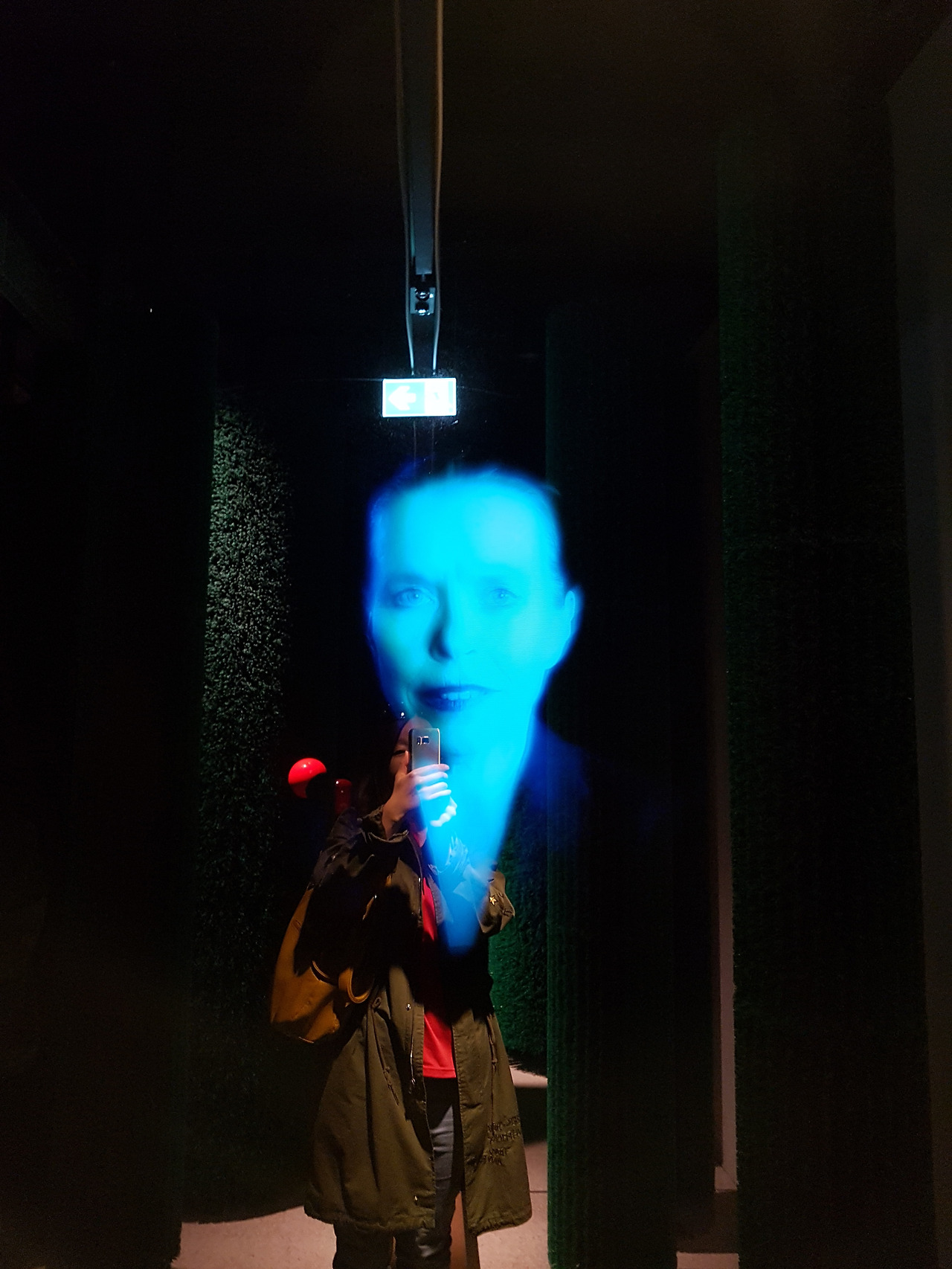 예를들어 미로 찾기 같은 숲을 지나 선 길 끝에 마주한 홀로그램 은 현대판 거울아 거울아 이세상 에서 누가 제일 예쁘니 라고 묻는 백설공주의 계모 마녀와 화상 체팅을 하는 것 같은 작품도 있었고