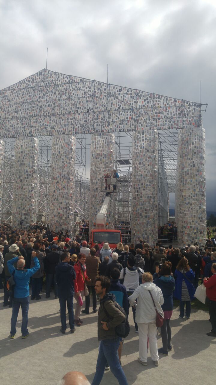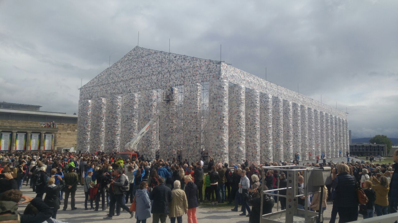 이번 도쿠멘타의 상징적 설치 작품인 책의 파르테논 은 금서 들을 가져다 그리스 신전 모양의 설치물에 걸어 전시를 한 것인데 ...중간 중간에 듬성 듬성 빈자리 들이 많았고 금서들을 기부 받고 있다고 한 것이 엊그제 같은데 어느새 작가가 마지막 책을 다 끼우고 ....(독일 친구들 중에서 히틀러 때 금서 였던 책 들을 집에 가지고 있다가 이번에 기부 한 친구들이 꽤 된다.)
