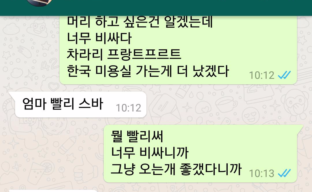 애용하는 wahtsApp 이 또로롱 들어온다. "엄마 내 머리가 굵고 길어서 저런 스타일로 하려면 180 유로래 어떻게 하지?" 으허헉 세다 염색하는 값만 그렇단다. 웨이브는 세팅을 집에서 셀프로 말던 아님 펌을 돈 더 내고 하던 말이다 내가 놀라고 있는 사이 또 또로롱~하고 "엄마? 내가 100유로 있는데... 어떻게 할까~?" 라고 독일 사람들에게
