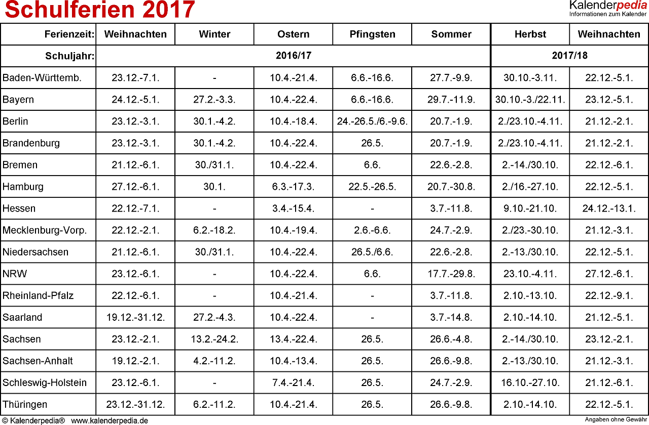 독일에서는 이렇게 다양한 방학 들이 각기 주마다 다르게 해마다 바뀌므로 방학 달력 Ferien Kalender이라는 것이 따로 있다.