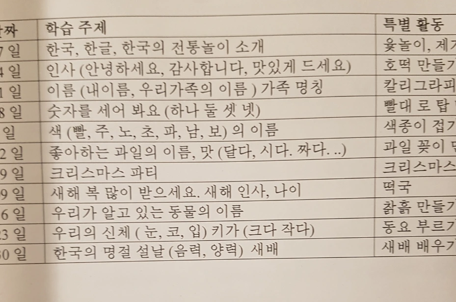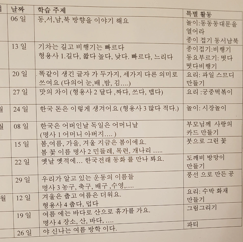 아직 아이들은 한국어로 제대로 표현하지는 못하고 말하고 쓸 줄 아는 단어 몇 개 , 숫자 몇 개 가 전부이지만 그동안 경험한 한국어와 한글, 한국요리,놀이들 동요 등을 통해 비행기를 타고 10시간이나 가야 만날 수 있는 조금은 낯선 나라 한국을 만난다.