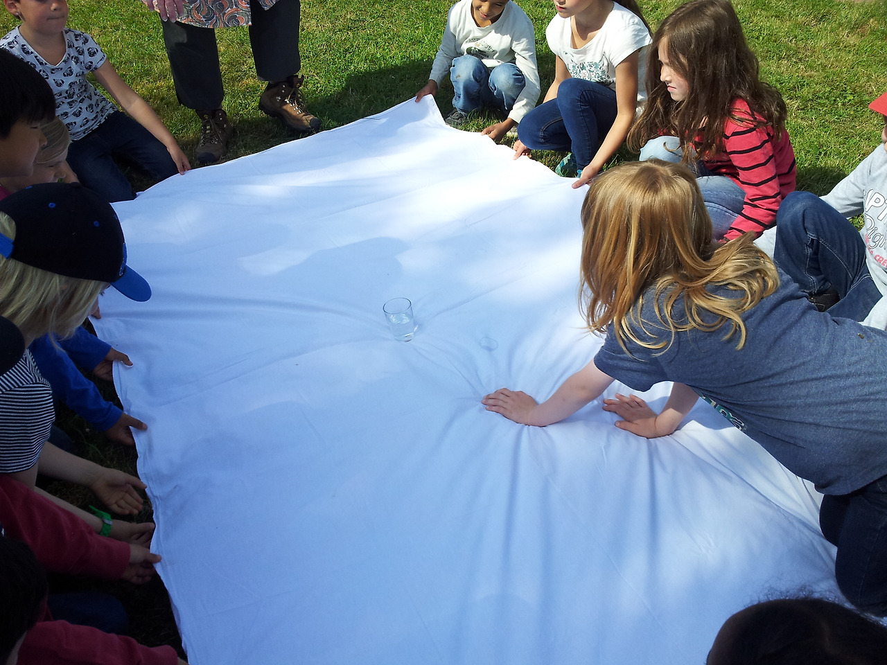 파란 잔디 위에 하얀 탁자 보를