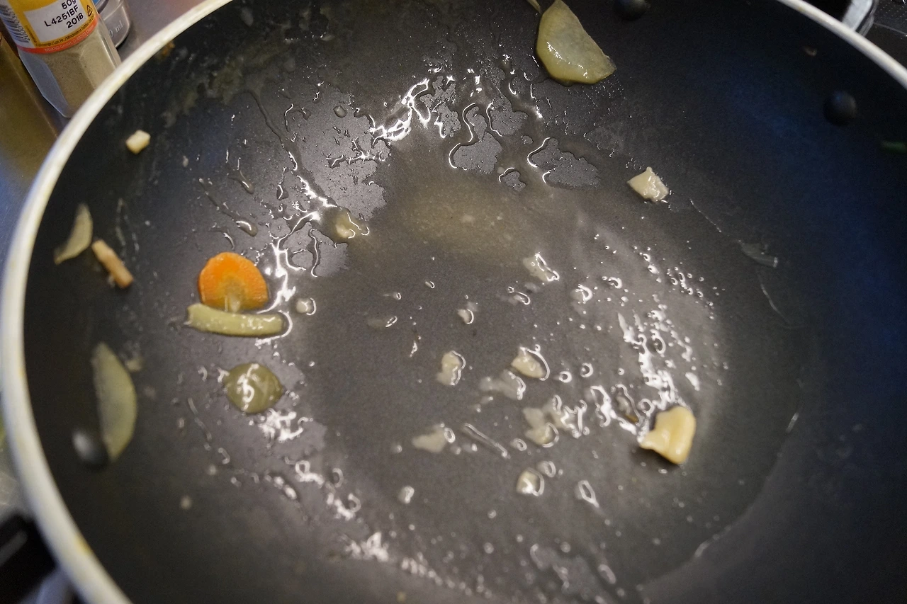 우려낸 육수를 빈 냄비에 부어서 준비한 채소를 넣어 끓이며 밑간을 했다.
