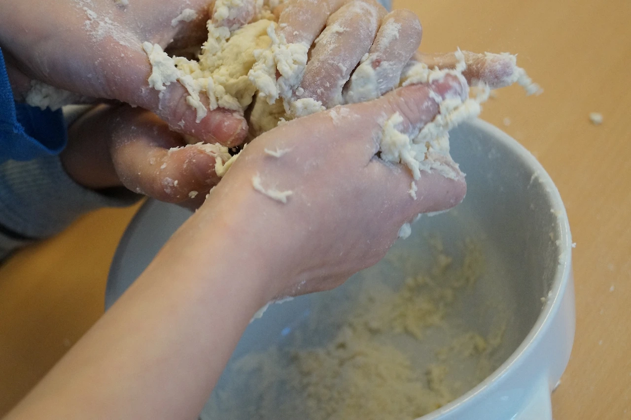 먼저 깨끗하게 손을 씻은 아이들과 체친 고운 밀가루에 물과 소금을 차례로 넣어 가며