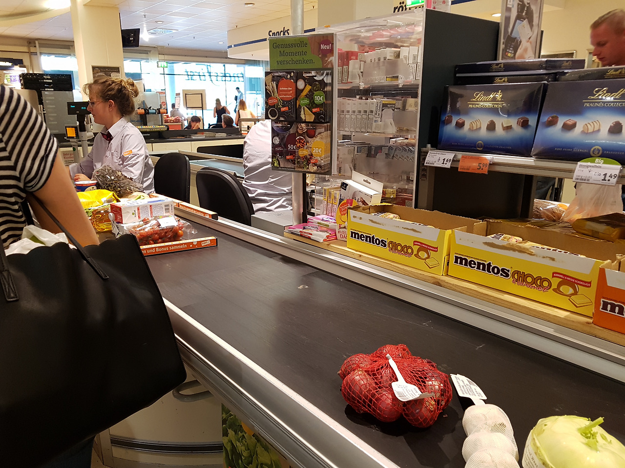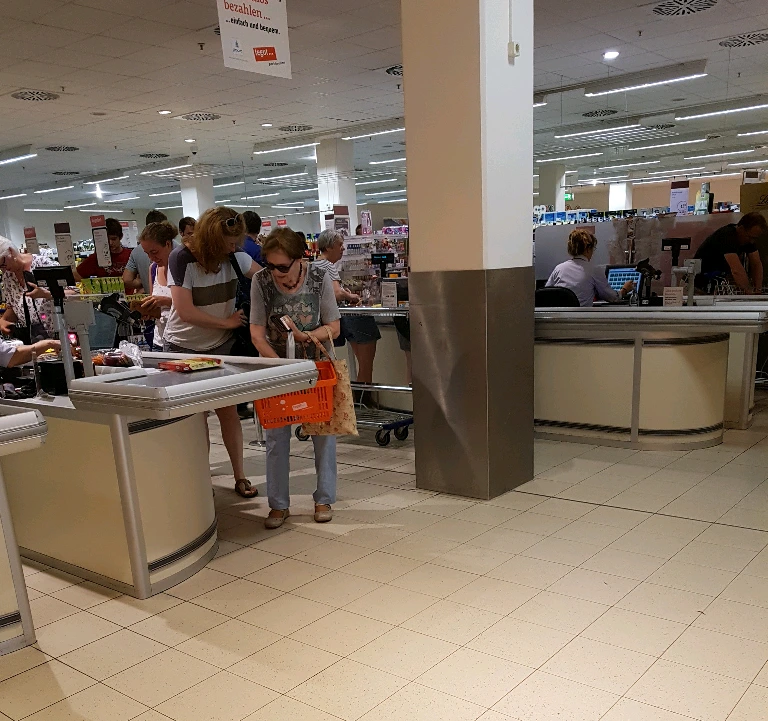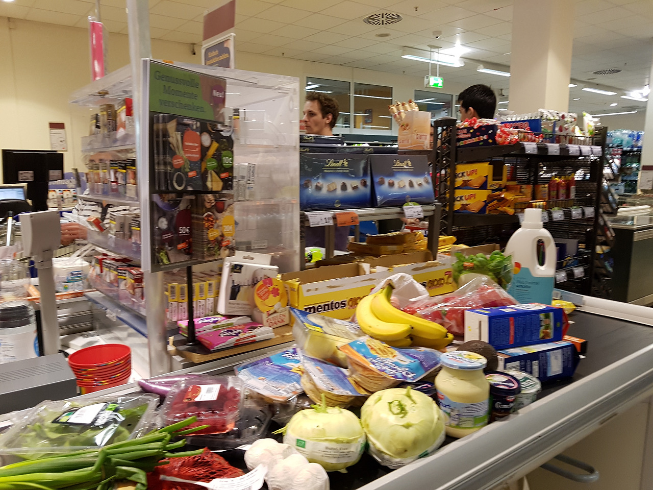 계산을 하고 차곡 차곡 시장 본 물건 들을 봉지 봉지에 나누어 어떻게 하면 잘 들고 갈수 있을까 ?를 (독일 마트 에서는 물건을 많이 사도 배달 서비스가 없다.그나마 요즘은 마트 중에 인터넷 으로 주문 한것을 배달료 포함 해서 정해진 날짜에 배달 하는 서비스가 되고 있기는 하다.)궁리 하며 요렇게 담고 조렇게 담고 하고 있을 때였다.