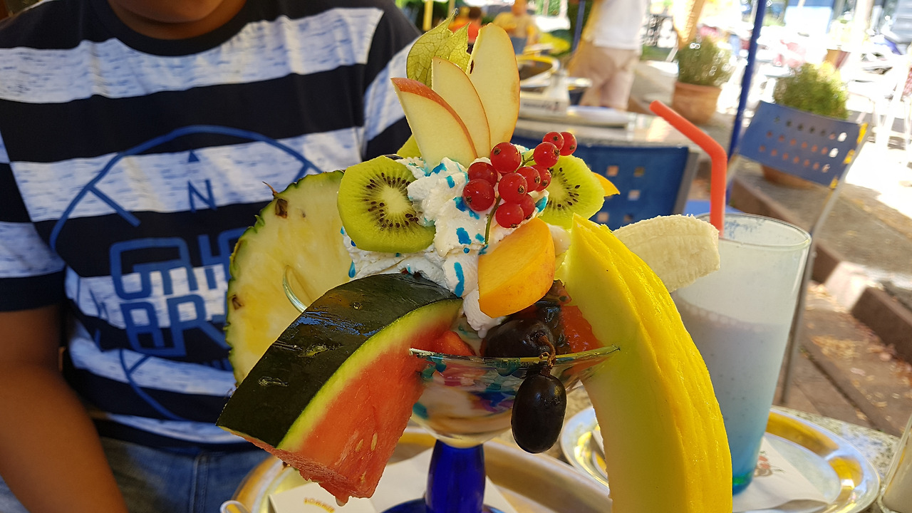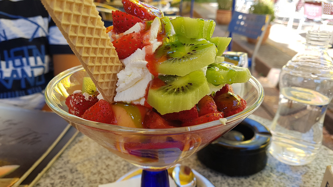 그 차림으로 노천 아이스 카페에 앉아 과일 빙수 대신 아이스크림 위에 과일 소복이 담겨 있는 사발?(유리컵이라 하기에 넓고 크다) 하나 받아 들면 그대로 이탈리아로 휴가 온 것이 따로 없었다.