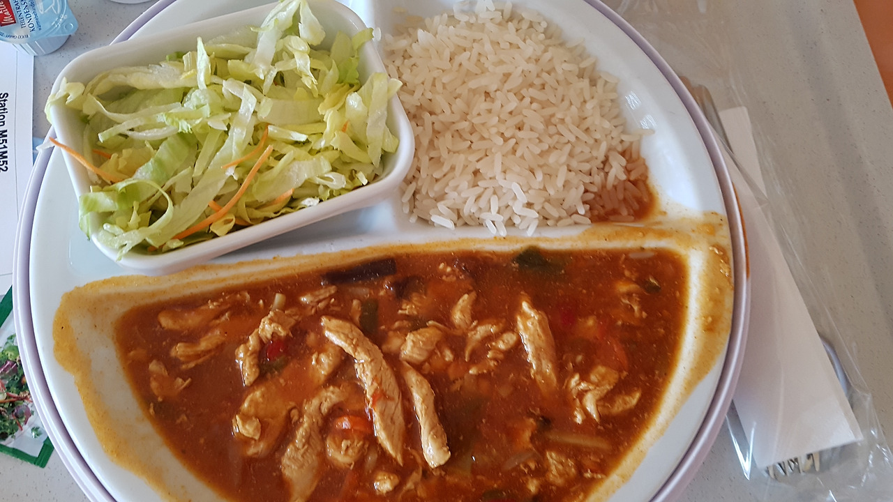 독일 병원 점심 식사. 닭고기 소스에 쌀밥 그리고 양상추 샐러드 쵸코 푸딩