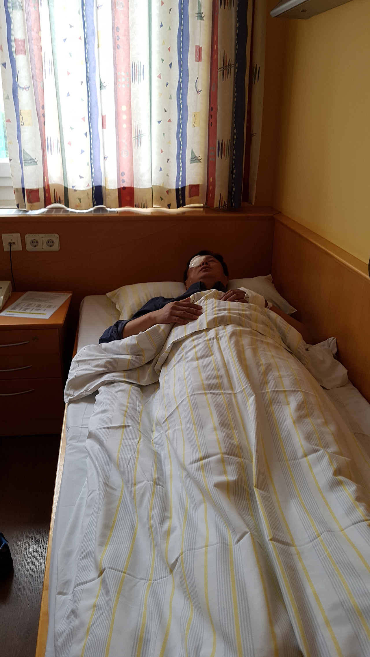 한쪽 눈에 하고 있는 커다란 안대와 손목에 감고 있는 브라뉼레 (수액 주사 꽂이) 만 아니라면 ..병원 같지 않은 분위기의 입원실..