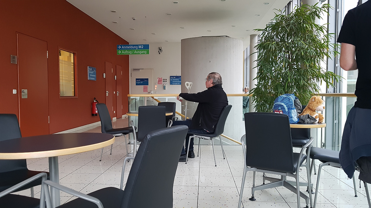 우리 동네 종합병원 안과 클리닉은 커다란 건물 몇 개로 구분되어 있는데 큰 건물 M3 일층에는 접수처와 환자 대기실 그리고 진료실들이 복도 전체로 나뉘어 있고 계단을 타고 올라가 이층에는 커다란 대기실과 수술실로 들어가는 출입구가 있다.