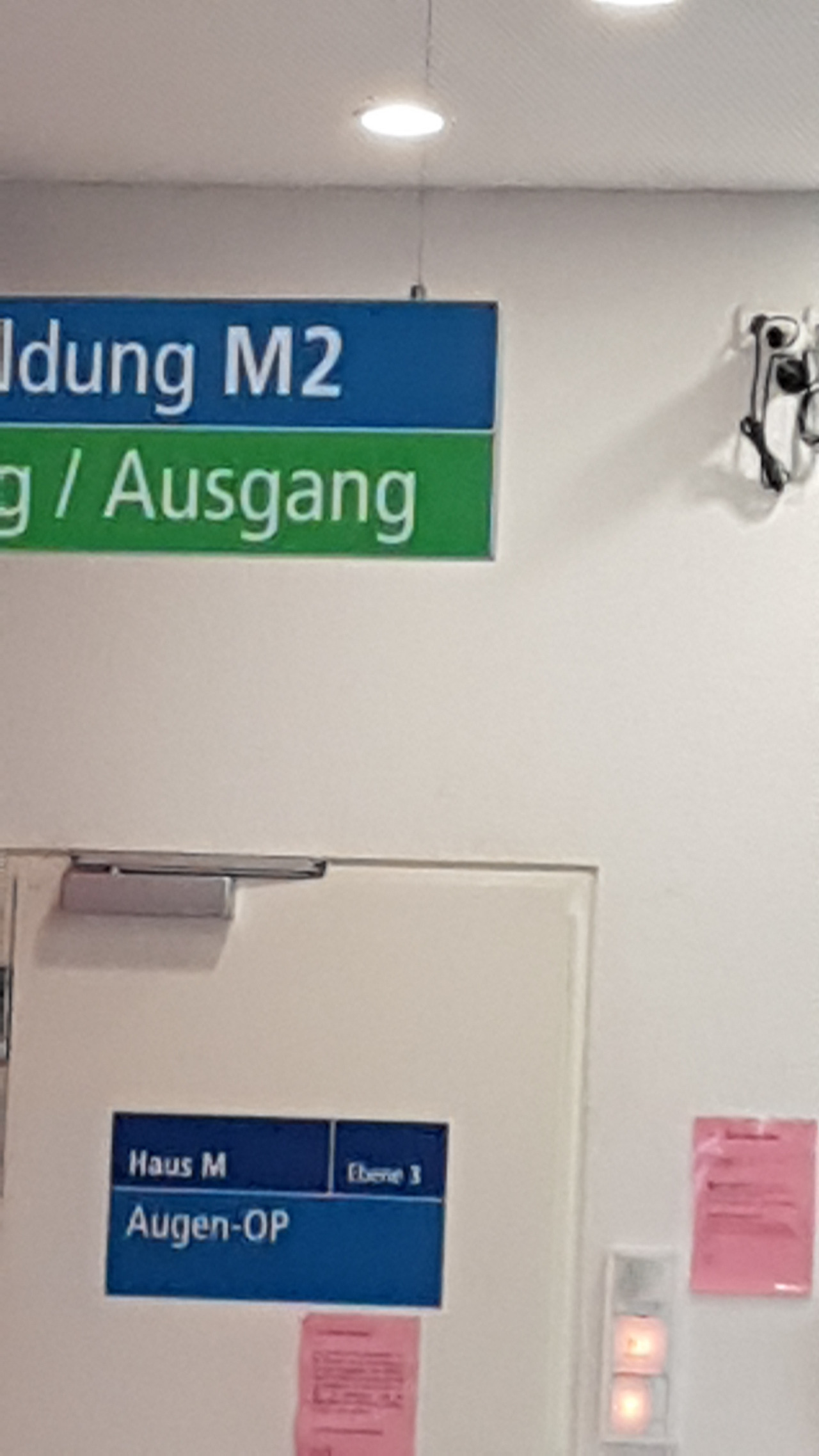 문짝에 Augen Op 라고 씌여 있고 핑크 종이 들이 붙어 있는 곳이 수술실 로 가는 첫번째 출입문 이다.