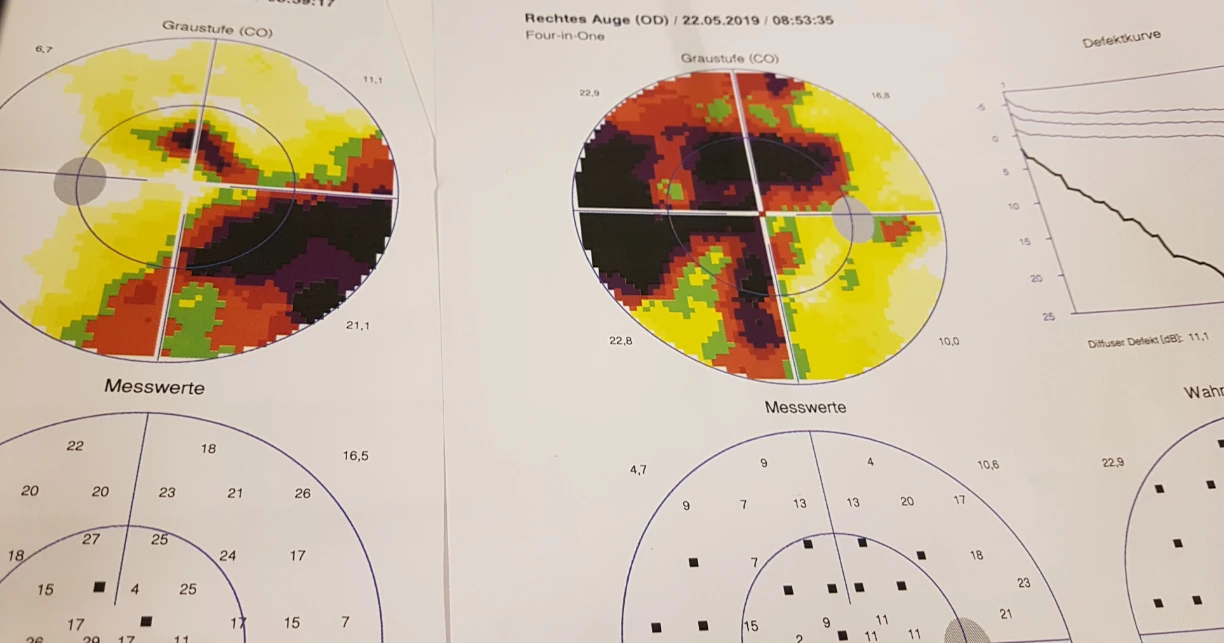 거기다 보통 녹내장 이 진행되면서 점차적으로 시야가 좁아지면서 주로 눈의 중앙 쪽으로만 보이는는 것에 반해 남편은 처음부터 가운데 쪽이 잘 보이지 않았다. 한마디로 독일 안과에서 이야기하는 일반적이지 않은 녹내장이다.