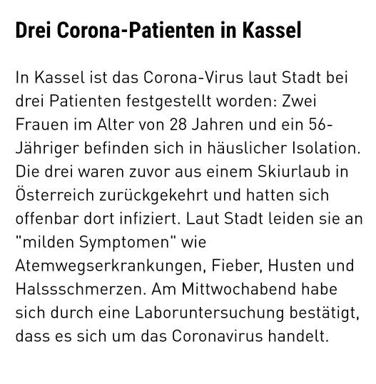 수요일 밤에 양성으로 판정된 카셀의 확진환자 들은 28세의 여성 두명과 56세여성 한명 으로 오스트리아에 스키 휴가를 다녀온후에 열,기침,인후통 등을 호소해 검사한 결과 확진 되어 자가격리 중이다.