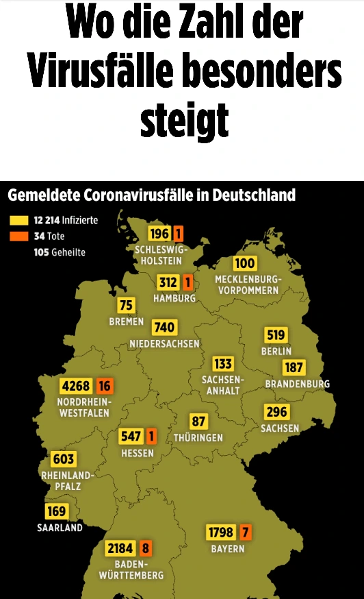 * 출처 Bild.de 독일의 코로나 19 확진자가 나온 주의 현황, 노란색이 확진자 수 오렌지색이 사망자 수 105명 완치.
