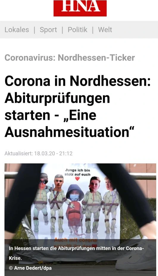 *출처 지역 신문 HNA , 코로나 사태에도 예외 조항으로 헤센주에서 치러지고 있는 독일 아비투어에 관한 기사 캡처.