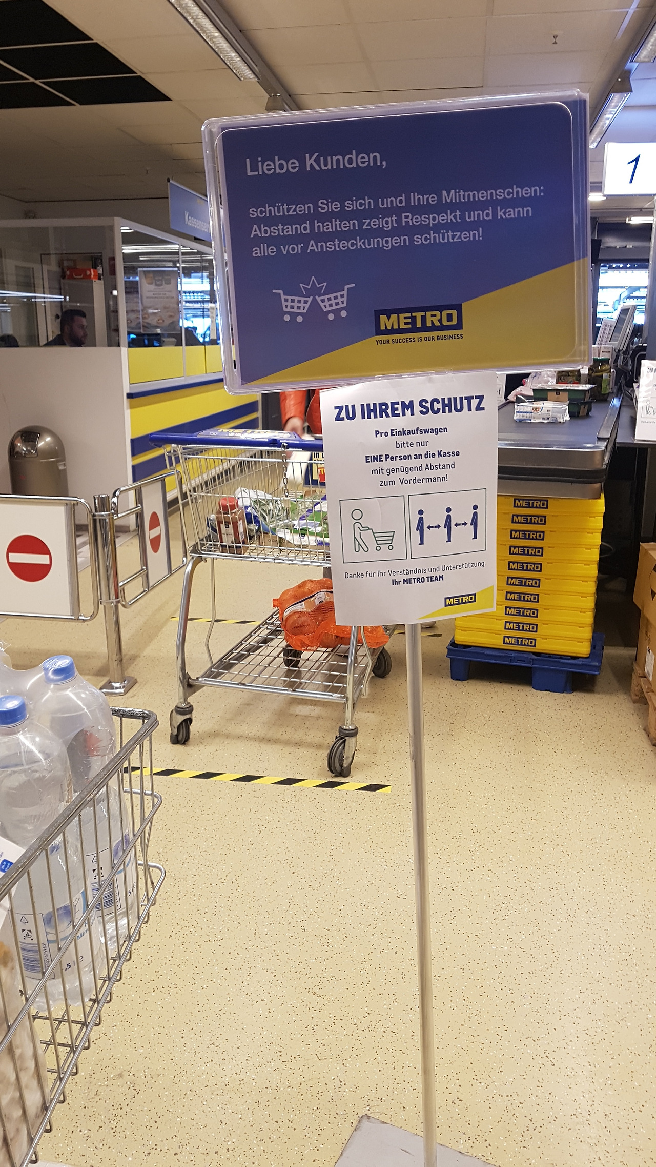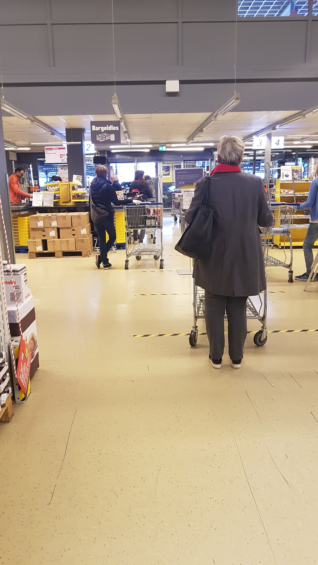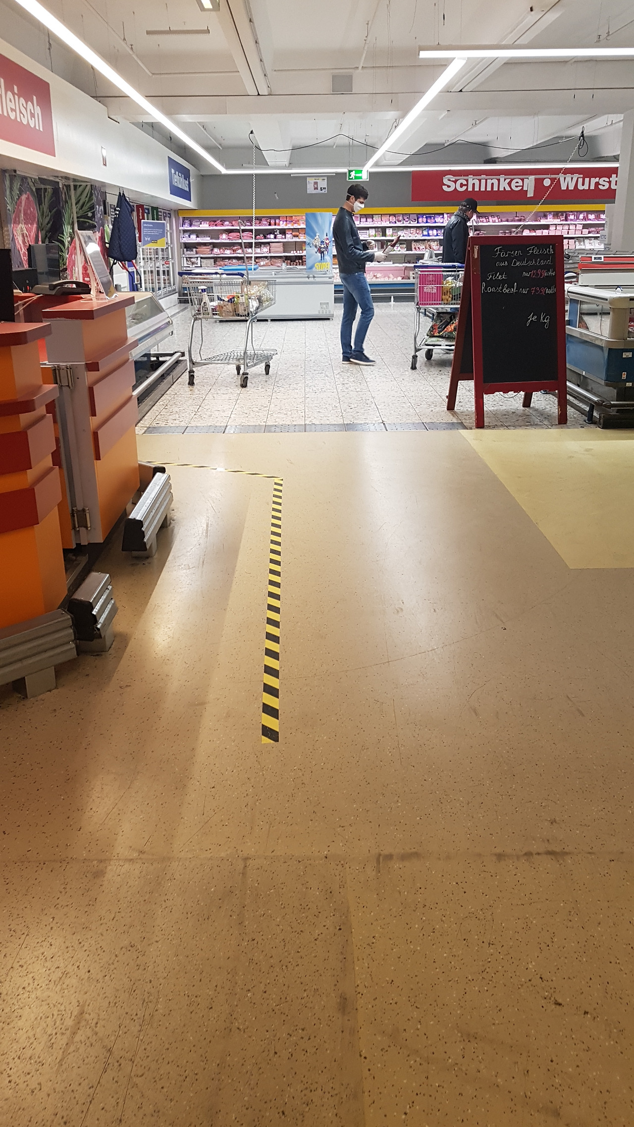 요사이 코로나 19 사태로 독일의 마트에서는 안에 공간이 한정적이다 보니 시장 볼 때 사람들 간에 거리 유지와 계산대에서 일하는 직원과의 거리 유지를 위해 한번에 마트에 들어가는 사람들의 숫자를 제한한다.