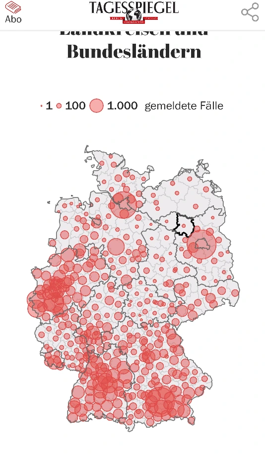 그도 그럴 것이 이제는 독일 전역에 경중과 다소의 차이만 있을 뿐 코로나가 안 퍼진 동네가 거의 없다시피 하다.(위에 사진 참고) 그래서 내 가족, 직장 동료 또는 이웃, 사돈의 팔촌 중에 코로나가 확진되는 경우도 허다하며 살고 있는 동네의 양로원 또는 요양원에서 집단 감염이 터진 곳들도 속출하고 있다 보니 이제 독일 사람들에게 코로나 19는 더 이상 남의일이 아니다.