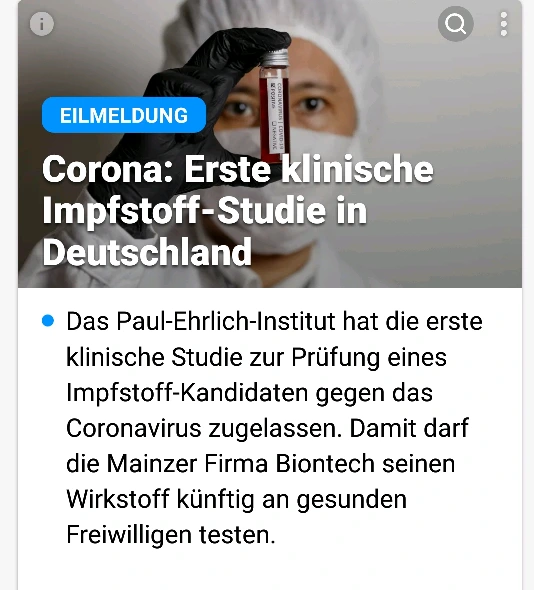 그리고 더 반가운 것은 내일 부터 독일의 한 연구소에서 개발하던 백신을 자발 적인 참여자들에게 주사할 수 있도록 결정되었데요.그 말인즉슨 조만간 코로나 19 백신이 시중에 나올 수 있다는 이야기 겠지요. 혹자는 늦어도 10월에는 이백신을 사용하게 되지 않을까 희망한다고 해요.