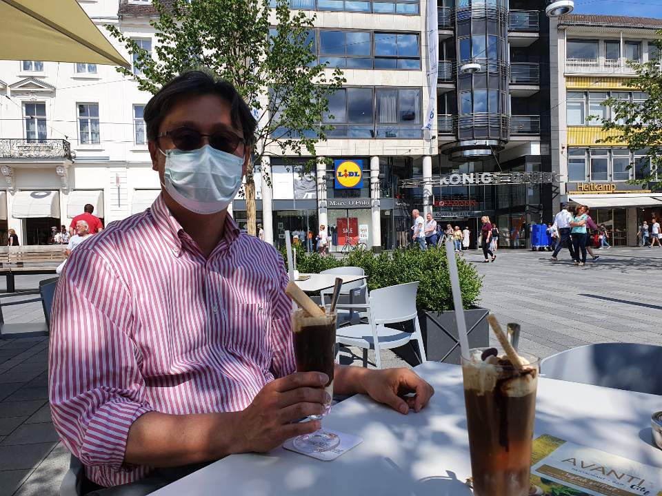 한참을 걸어 내려간 우리는 시내 중심에 위치한 노천카페에서 예전보다 서로의 간격이 멀찍이 떨어져서 놓인 테이블 중에 가장 끝 자리에 가서 앉았다. 그리고 여름을 만끽할 아이스커피를 시켰다.