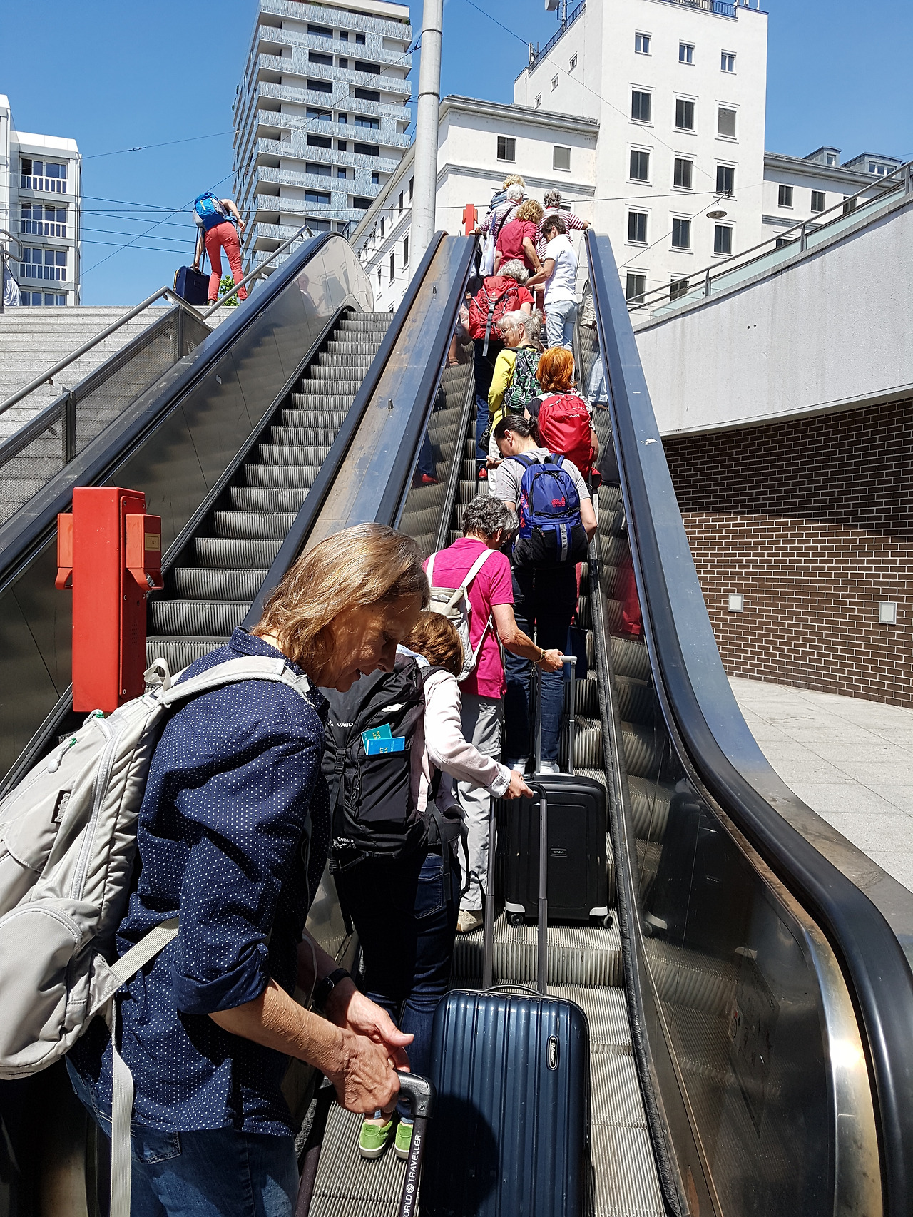 그때 기차를 들었다 놨다 한 그 칸 에는 막내이던 35세의 크리스틴부터 큰언니 75세의 홀가 까지 모두 24명의 센 언니들이 함께 였고 베를린에서 축구 응원을 가는 중이 라며 형님 들 같은 체격의 20 30 아들 또는 손자 뻘의 남정네 팬클럽이 단체로 들어와 있었다.