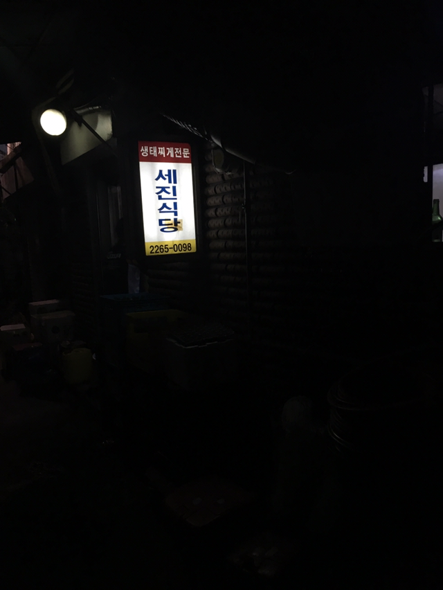 뭐랄까. 굉장한 보통의 맛이다. 실상 이렇게 깊은 안쪽 골목까지 신선한 생선을 서배 해 오는 것이 어렵거니와, 그런 재료를 공수해 온들 수지타산을 맞출 수가 없을 것 같다. 찬은 다들 악에 바쳤는지, 새빨간 것들만 나와서 나는 괴롭기만 한데 옆 테이블 아저씨들은 안주삼아 흥건히 이야기가 끊이질 않는다. 그리고 깨달은 것은 이 가게는 맛으로 오는 것이 아니다. 이런 류의 경험은 잠실 포차(지금은 제2 롯데월드 공사로 역사의 뒤안길로 사라졌다.)나 가락시장 노점 횟집(아마도 가락시장 현대화 공사가 마무리되어 점점 없어질 것 같다)에서 먹는 그런 기분의 맛이다. 나도 모르게 목소리를 높이고, 격해지는 감정의 기분이 - 혹은 쉽게 하소연하게 될 것 같은 마음이 드는 그런 맛이기 때문이다. 한마디로 생태탕은 맛없는데, 그런 맛이 있다. 오히려 더 맛이 없었으면 울면서 먹었을지도 모를 노릇이다.