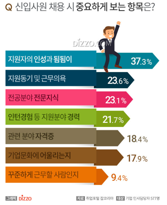 아래 표처럼 실제로 사람을 뽑을 때는 번지르르한 것들보다 중요한 항목들이 있는데 진짜 이게 중요하다니까. 그러니까 내가 어학점수가 없다고 혹은 자격증이 좀 없다고 인턴 경험이 부족하다고 졸지 마.