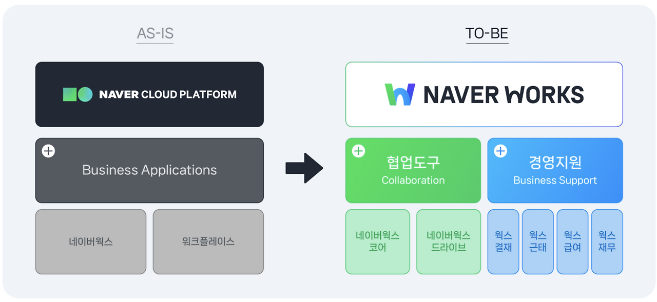 국내 기업 네이버 클라우드에서 운영 중인 업무용 협업 툴이다. 협업할 때 필요한 게시판 기능부터 채팅, 그룹채팅을 제공한다. 특히 네이버의 제품이기에 라인과 연동된다는 강점뿐만 아니라, 파파고 번역, 네이버 클라우드, AI 기반의 기능들까지 (클로바) 제공하는 것이 강점이라고 할 수 있겠다. 커뮤니케이션 도구로서 실시간 소통에 초점을 맞췄으며 사용성에 있어서는 비슷하거나 거의 같게 네이버라는 서비스가 주는 익숙함이 그대로 녹아들어 갔기에 사용자 입장에서는 별다른 거부감이나 이질감 없이 사용할 수 있다고 전해 들었다. 앞서 설명한 협업의 측면에 있어 번역 기능이나, 채팅, 메일 같은 커뮤니케이션에 무게를 둔 제품이기에 국내외로 다양한 언어로 소통해야 하는 사업자들은 시너지 효과를 누릴 수 있다. 다만 네이버 웍스의 경우 2024년 6월 4일을 기준으로 본격적으로 협업도구이자 경영지원 도구로 발전할 계획을 가지고 있다고 한다. ERP, 향후 출시 이후의 동향을 살펴보는 것도 중요하겠다.