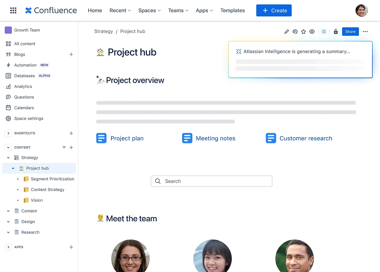 Confluence는 기업의 지식을 저장할 수 있는, 다르게 말하면 온라인 도서관과 같은 협업 툴이다. 프로젝트별, 부서별, 직무별 지식이 위키 형식으로 쌓이는 것이 특징이다. Atlassian에서 제공하고 있으며 스페이스와 페이지가 Confluence의 핵심 기능이다. 각 페이지에는 텍스트, 이미지, 파일, 동영상 등 다양한 콘텐츠를 포함하는 형식으로 작성된다. Google workspace와 마찬가지로 동시 편집 및 버전 관리도 가능한 것도 강점이다. 다이어그램, 차트, 갠트 차트 등 다양한 매크로를 활용하여 페이지를 시각화할 수 있다. 강력한 검색 기능도 차별화되는 강점인데, 말 그대로 위키 형식인 만큼 검색 기능의 존재가 매우 핵심적이다. 개발 분야에 있어서 자주 쓰이는 Jira, Trello 등 Atlassian 제품과 기본 통합되며, 수많은 서드파티 앱과도 연동이 가능하다. 위키형태로 지식이 쌓인다는 점이 앞서 설명한 Microsoft SharePoint, Google Workspace 등 다른 협업 도구와 차별화되는 거의 독자적 특징이라고 할 수 있겠다.