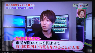 'BNF', '테스타' 같은 몇십~몇백억 엔 (한화로 몇백억~몇천억 원)을 벌었다는 유명 데이트레이더들이 방송에 출연하여 삐까번쩍한 아파트에서 5~6개의 화면을 보면서 생활하는 게 멋있어 보였다.