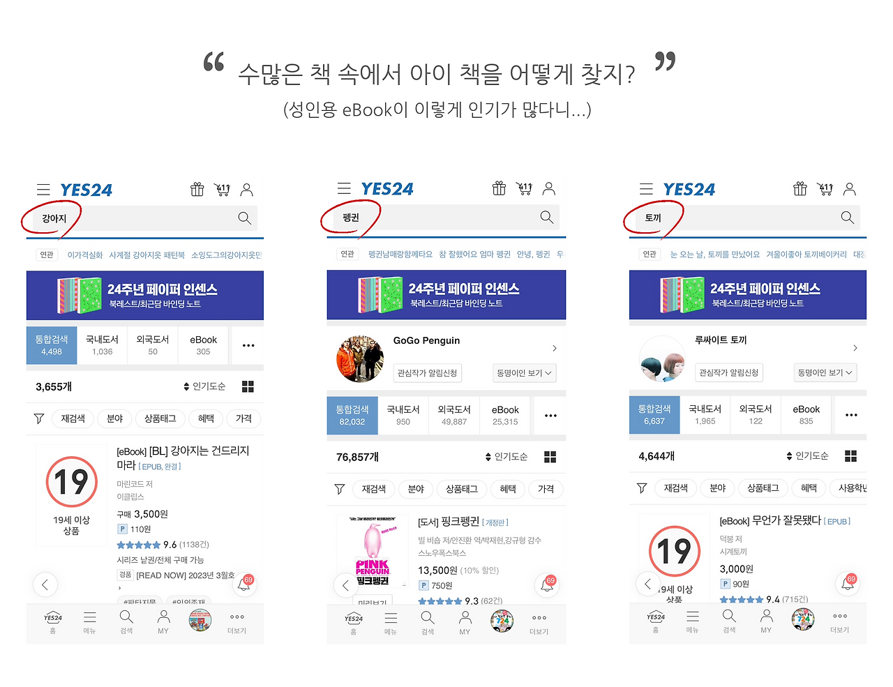 대부분의 아이들은 동물이 등장하는 아기자기한 그림책은 대부분 좋아할 가능성이 크기 때문에 아이가 강아지, 펭귄, 토끼 같은 동물을 좋아한다고 가정해 보자. 개인적으로 예스 24에서 책 검색을 많이 하기 때문에 해당 서비스를 이용해서 책을 검색하는 과정을 함께 해보고자 한다. 앞서 언급한 강아지, 펭귄, 토끼를 검색해 보도록 하겠다.