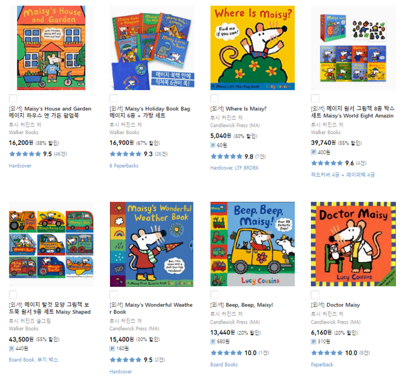 원서지만, 아이들이 좋아하는 책 중 하나가 Maisy 시리즈인데, 이 책은 등장인물이 모두 동물이다. 제목에 명시적으로 동물이 등장하지는 않지만, 색감도 쨍하고, 그림이 아기자기하고 이쁘다. 돌 전후부터 두세 돌까지 아이 선호에 따라 읽히기 좋은 책 중 하나이다. '루시 커진즈 (Lucy Cousins)'라고 검색하면 엄청나게 많은 책을 볼 수 있다. 보드북, 플랩북, 팝업북 등 다양한 형태의 책이 있어서 어린 시기부터 보여주기 좋다. 외국 작가지만, 엄마 마음이 담겨있는 책이다. 아이들이 좋아할 만한 소재를 매우 잘 활용한 책이라 아이가 어릴 때 여러 번 반복해서 읽으면서 역할놀이하기 참 좋은 책이다.
