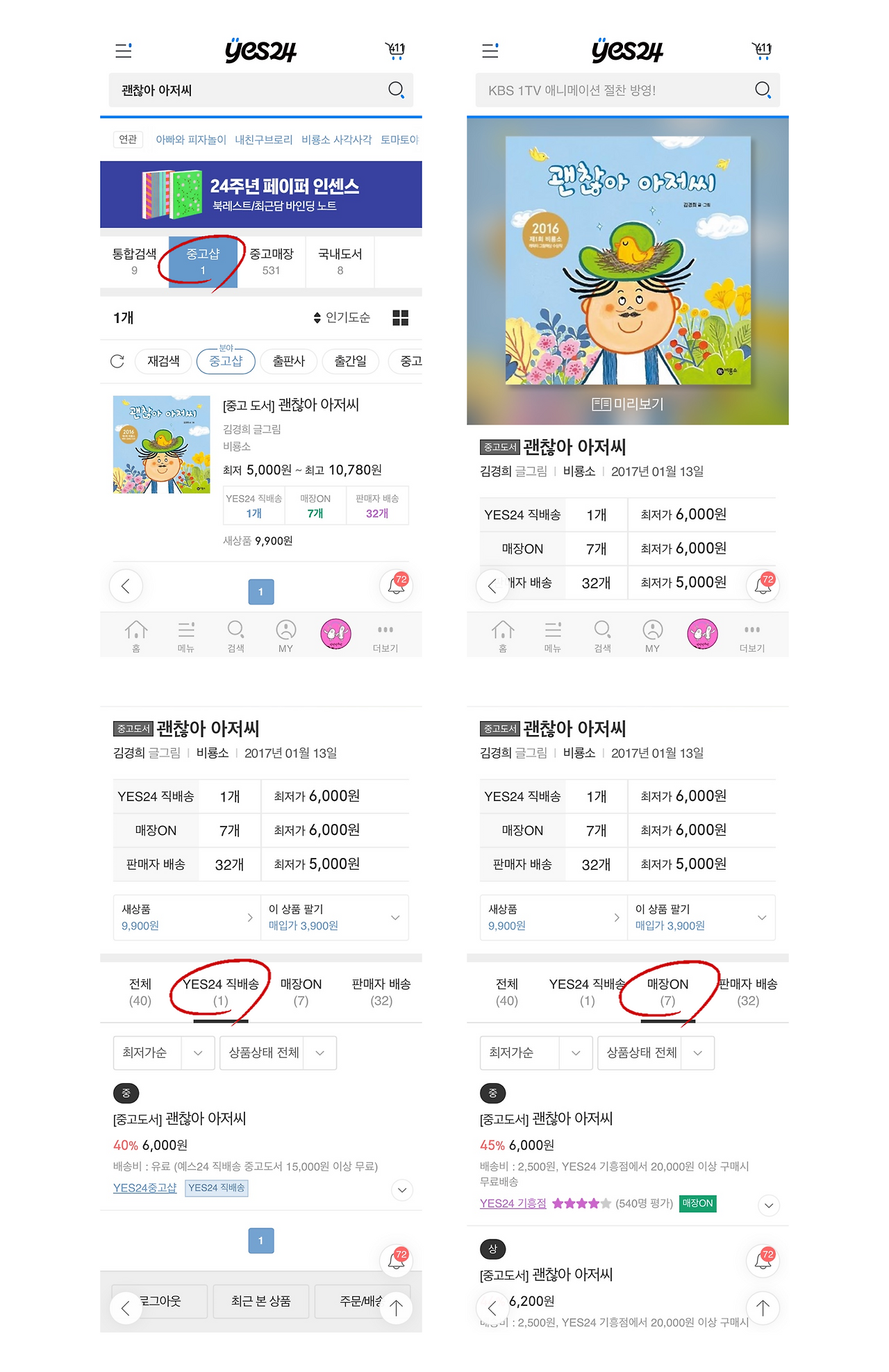잘 사면 유명한 책도 반 값 이하로 살 수 있어서 참 좋은데, 조금은 피로도가 높은 중고 책 구매 방법이다. 원하는 중고책 단행본 몇 권을 무료 배송 기준에 맞춰서 구성하는 것이 쉽지가 않은 경우가 많다. 그래도 아이 책에 진심이시라면 이용해 보시길 바랍니다. (저는 yes24와 전혀 관계는 없는데, 개인적으로 애용하는 플랫폼이라서 책과 관련된 글을 쓰면 자꾸 언급하게 되네요.)